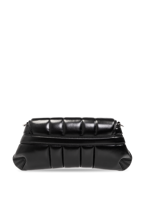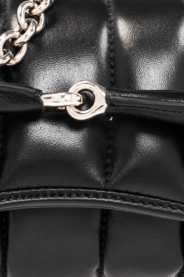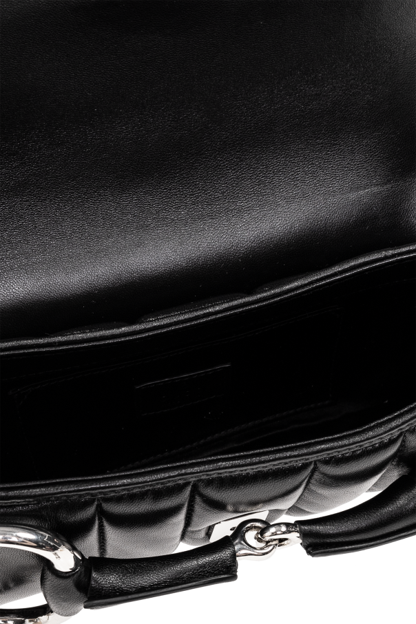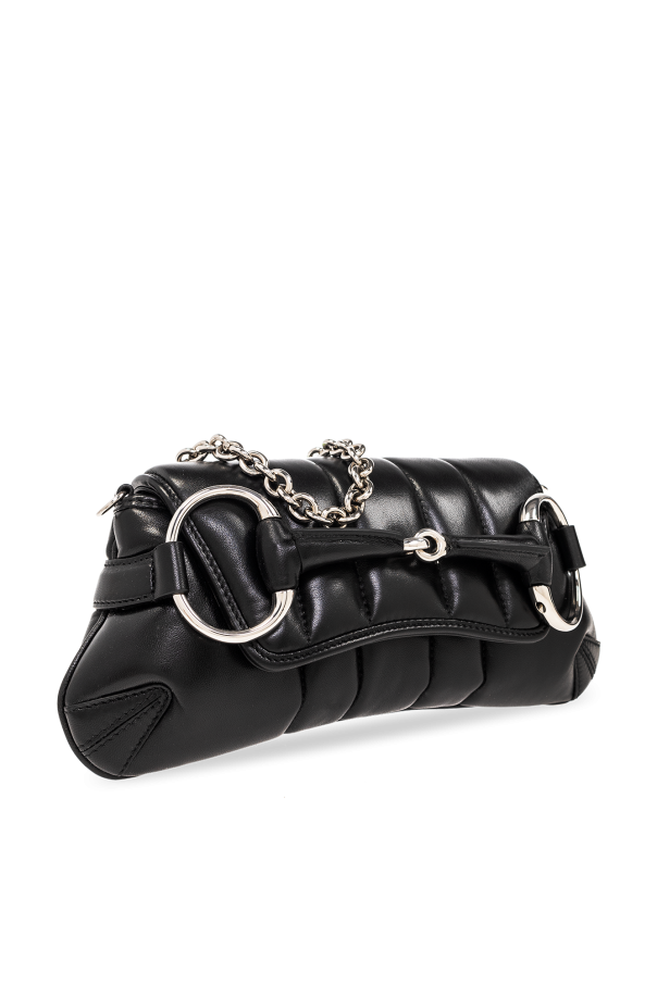 Black ‘Horsebit Chain Small’ handbag from Gucci. Crafted from lamb leather, this design features a flap with a snap closure, the brand’s signature oversize horsebit, quilting, detachable strap and chain, silver-tone metal hardware and one internal compartment with one slip pocket.