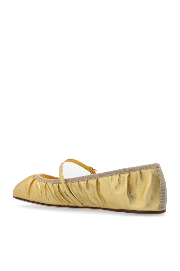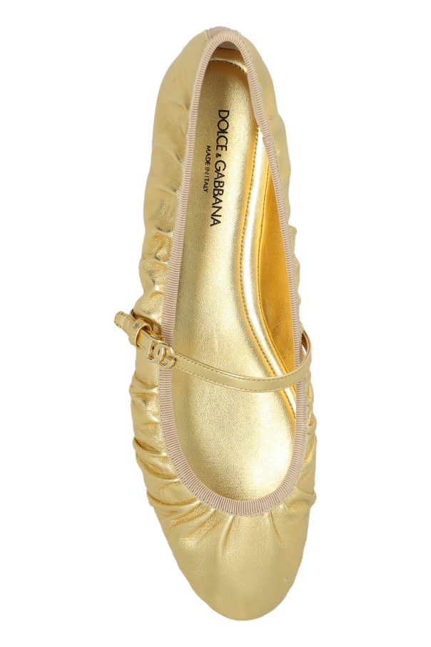 Introducing the epitome of sophistication and style: the Leather Ballerinas by Dolce & Gabbana. These exquisite shoes embody the unparalleled elegance and craftsmanship synonymous with this iconic Italian brand. Crafted from premium leather, these ballerinas feature a classic, flat silhouette complemented by delicate ruching along the sides, adding a touch of unique charm and refinement. The metallic gold finish bestows a luxurious sheen, making them an ideal choice for both everyday wear and more formal occasions. The thin strap across the instep, adorned with a petite buckle, enhances their femininity while ensuring a secure fit. Inside, the signature "DOLCE & GABBANA" inscription attests to their exclusive origin. The ballerinas are designed with a flexible edge, providing unmatched comfort for all-day wear. Why Choose This Product? Exquisite design by renowned Dolce & Gabbana Premium leather construction for durability and quality Luxurious metallic gold finish Comfortable, flexible edge Elegant ruching and adjustable strap for a sophisticated look