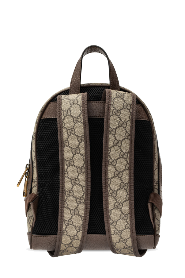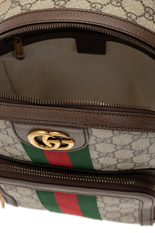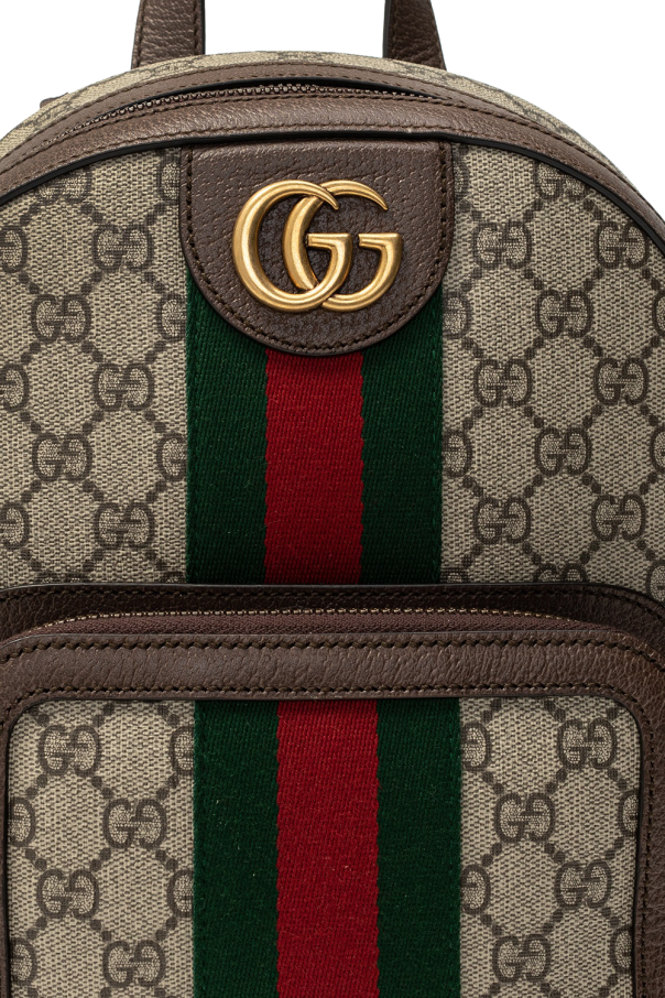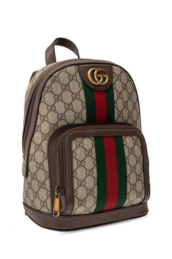 Beige and brown ‘Ophidia GG’ backpack from Gucci. Crafted from GG Supreme canvas, this design features a zip fastening, gold-tone logo detail, the brand’s signature green and red Web stripe and a zip pocket on the front as well as a semi-round handle, adjustable shoulder straps and textured leather trims in brown. The interior is lined with beige fabric and includes two slip pockets and one zip pocket.