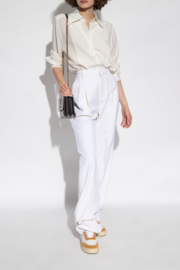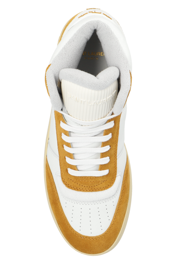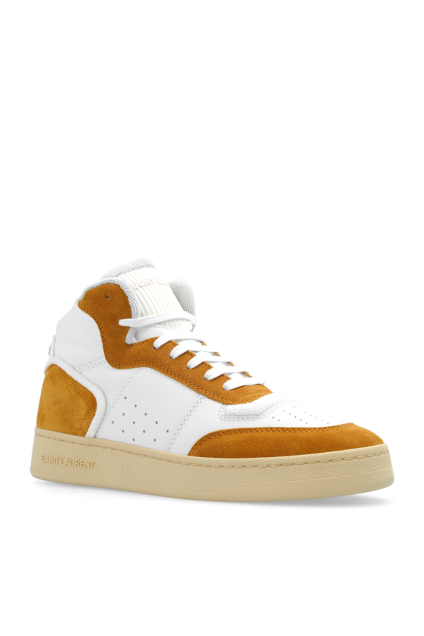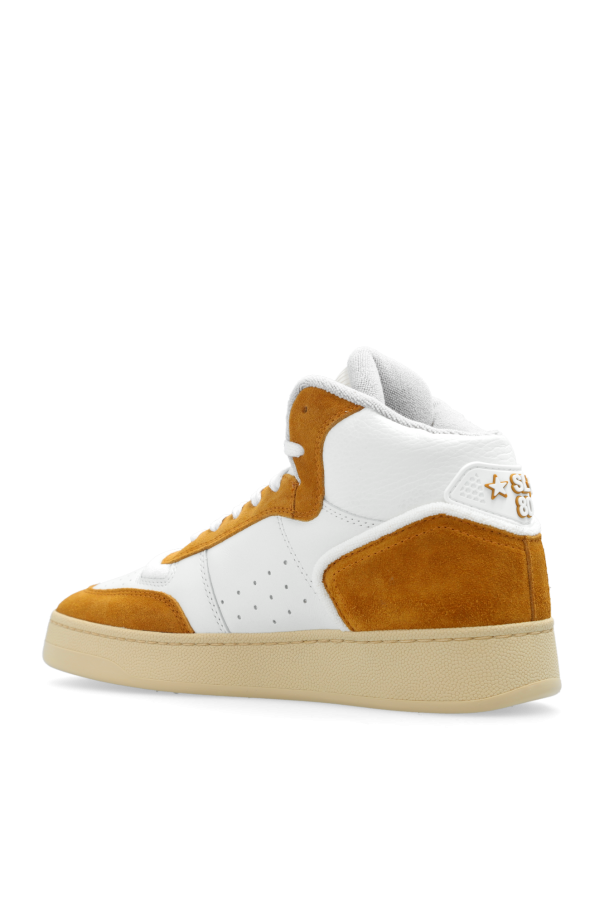 White and brown ‘SL/80’ sneakers from Saint Laurent. Made of smooth leather and suede with a high-top silhouette, this lace-up model sits on a cream rubber sole and showcases the brand's logo, rubber inserts and decorative perforations.