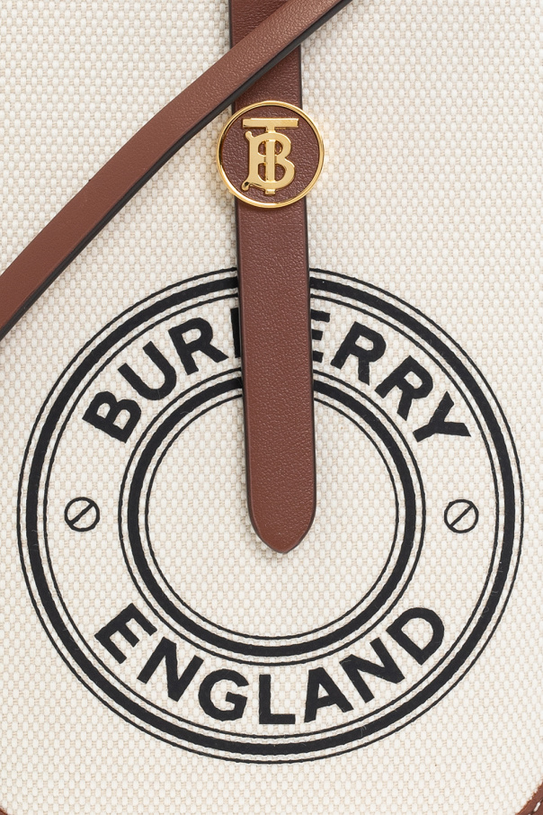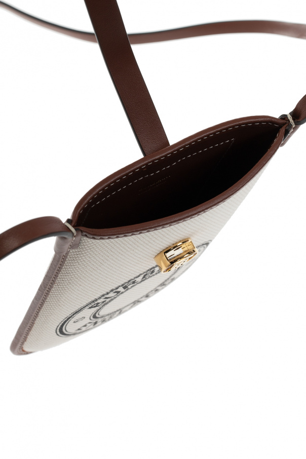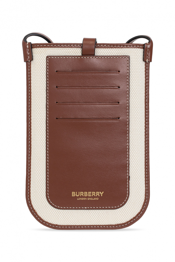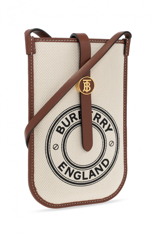 Beige and brown ‘Anne’ phone holder from Burberry. Crafted from canvas and trimmed with calf leather, this item features a strap fastening with a logo plaque, a black logo print on the front, four card slots at the back, an adjustable shoulder strap and one internal compartment.