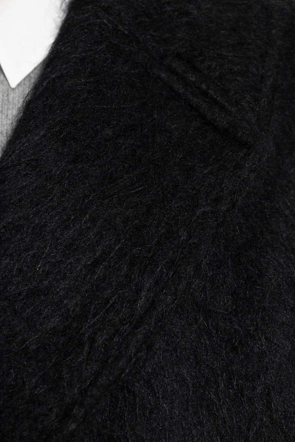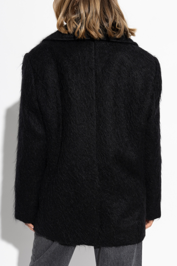 Introducing the Wool-Trimmed Coat by Acne Studios, a paragon of sophistication and timeless elegance. This exclusive coat is meticulously crafted to perfection, featuring a simple, classic cut that accentuates the shoulders and extends to hip length. The dominant black color, coupled with the plush and soft texture of high-quality wool, bestows an air of refined luxury. The coat's surface exhibits a delicately hairy appearance, enhancing its opulent allure. Notable details include a central fastening with two buttons, two hip-level flap pockets, and a wide, classic collar with a distinct lapel. The interior is lined, ensuring exceptional comfort and a polished finish. This versatile piece, as shown in the accompanying images, pairs seamlessly with casual attire, making it suitable for both everyday wear and more formal occasions. The coat is a testament to the brand's ethos, blending practical minimalism with avant-garde designs, as envisioned by founder Jonny Johansson. Why Choose This Product? Exquisite blend of wool, mohair, and alpaca for unmatched softness and warmth. Classic design with modern detailing, suitable for various occasions. High-quality craftsmanship from the esteemed Acne Studios. Two convenient hip-level pockets with flaps.