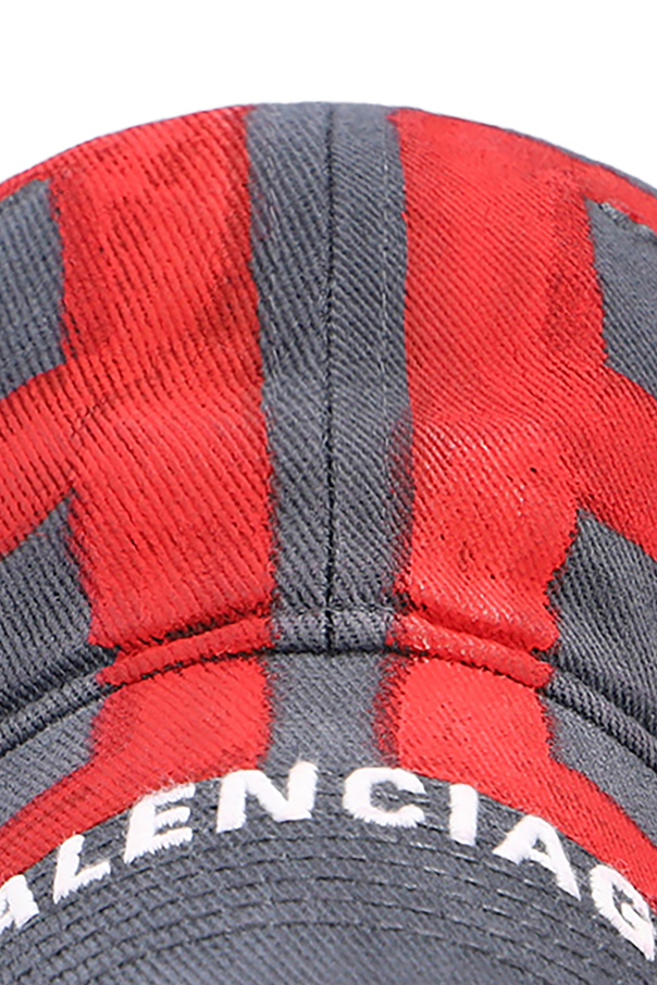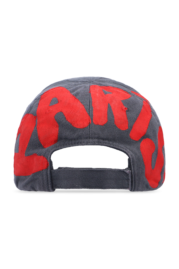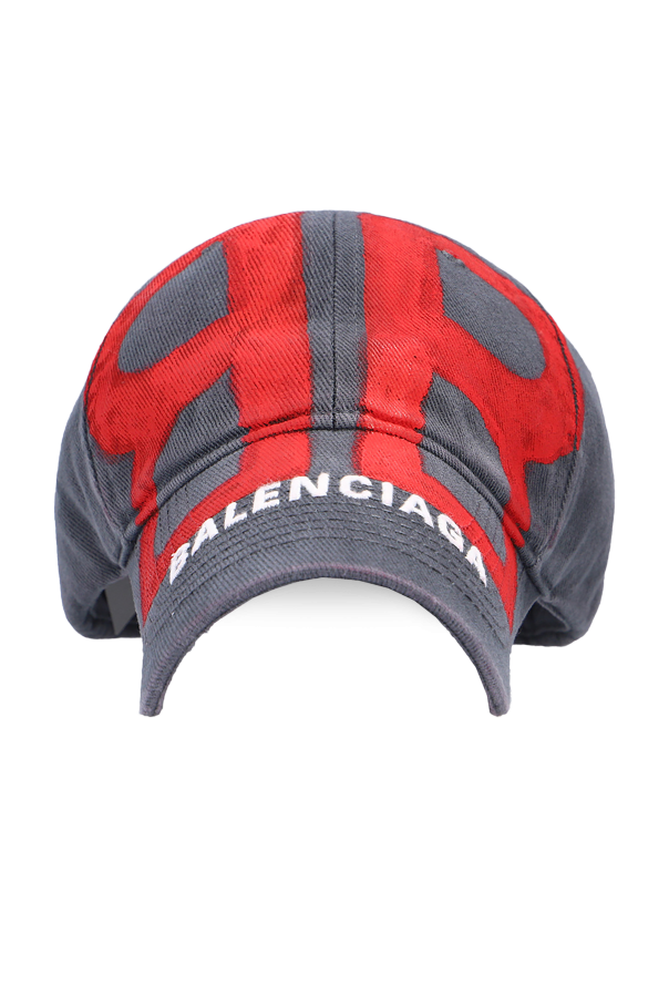Dark grey baseball cap from Balenciaga. Made of cotton, this design features a white logo embroidery, red print and velcro strap at the back.
