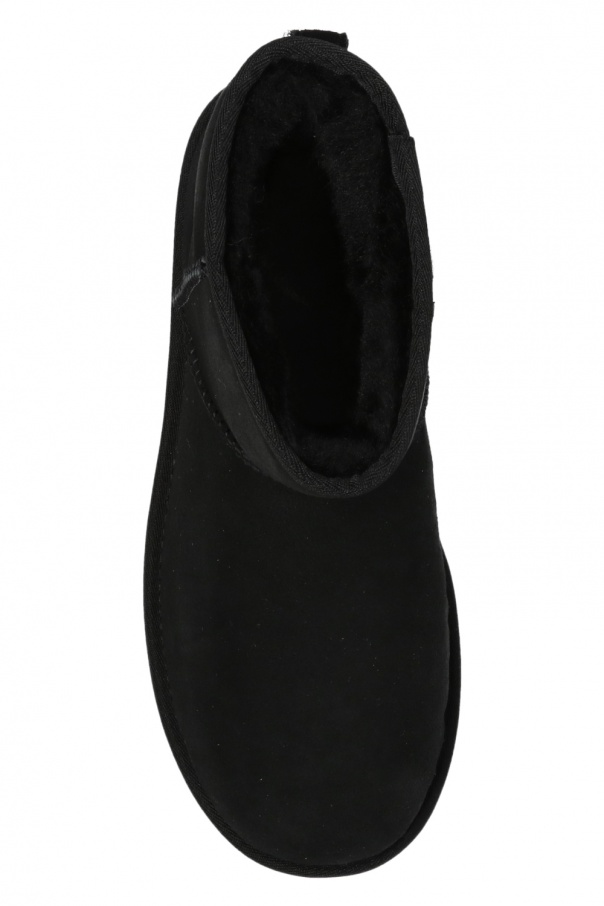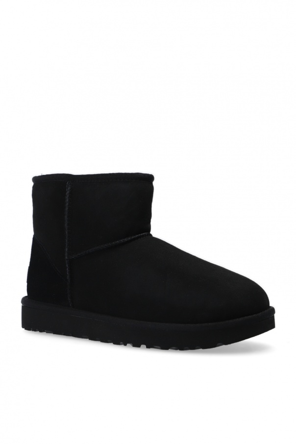 Black 'W Classic Mini II' snow boots from UGG. Crafted from suede, this pair is set on a lightweight and flexible black sole in EVA foam and features lamb's wool lining, distinctive stitching details as well as logo patch on the heel for the brand recognition.