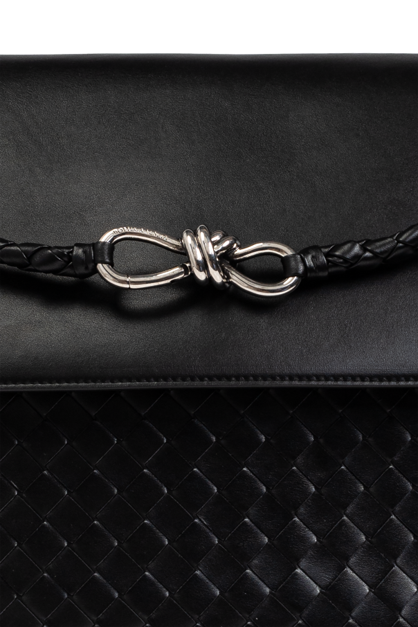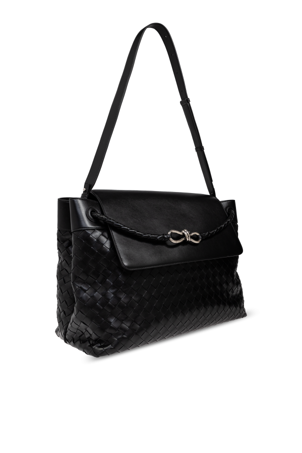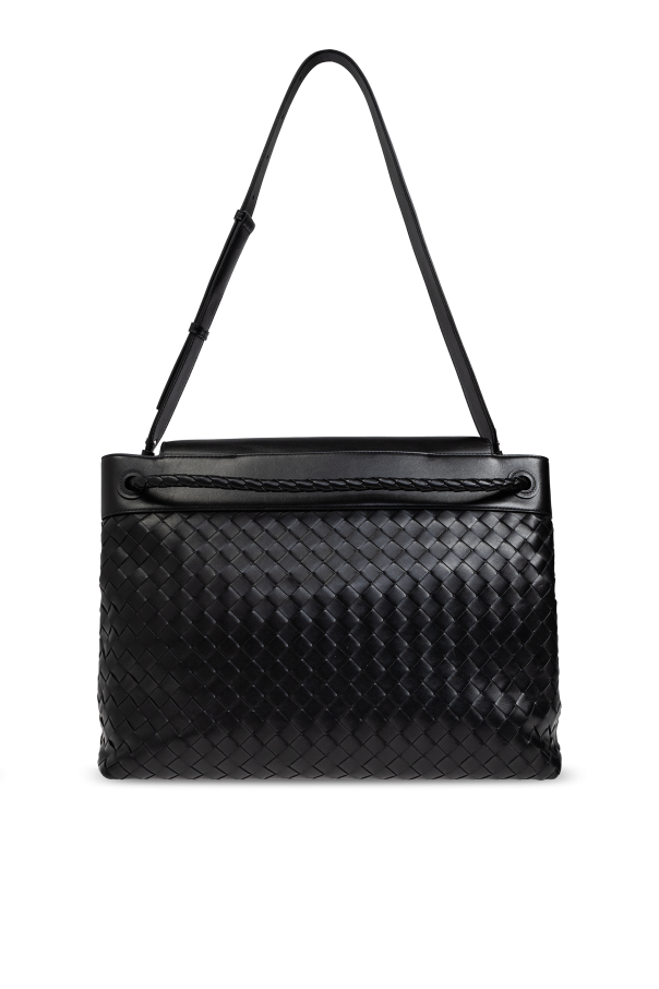 Introducing the Andiamo Large shoulder bag, an epitome of sophistication and elegance from the celebrated house of Bottega Veneta. Crafted from the finest 100% leather, this exquisite black bag is a testament to the brand's dedication to unparalleled craftsmanship and luxurious design. The bag features an intricate woven pattern across the main body, exuding a refined allure, while the sleek flap is adorned with a decorative metal knot closure, adding a touch of opulence. Designed for practicality, the long strap allows for effortless shoulder carry. The interior is both spacious and thoughtfully organized, boasting two separate compartments, a zip pocket, and three slip pockets, all secured by a magnetic snap closure. This meticulous attention to detail ensures that your essentials are both secure and easily accessible. Why Choose This Product? Elegant design with a signature woven pattern and metal knot closure. High-quality 100% leather for a luxurious feel. Spacious interior with multiple compartments for optimal organization. Designed by the renowned Bottega Veneta, known for innovation and tradition.