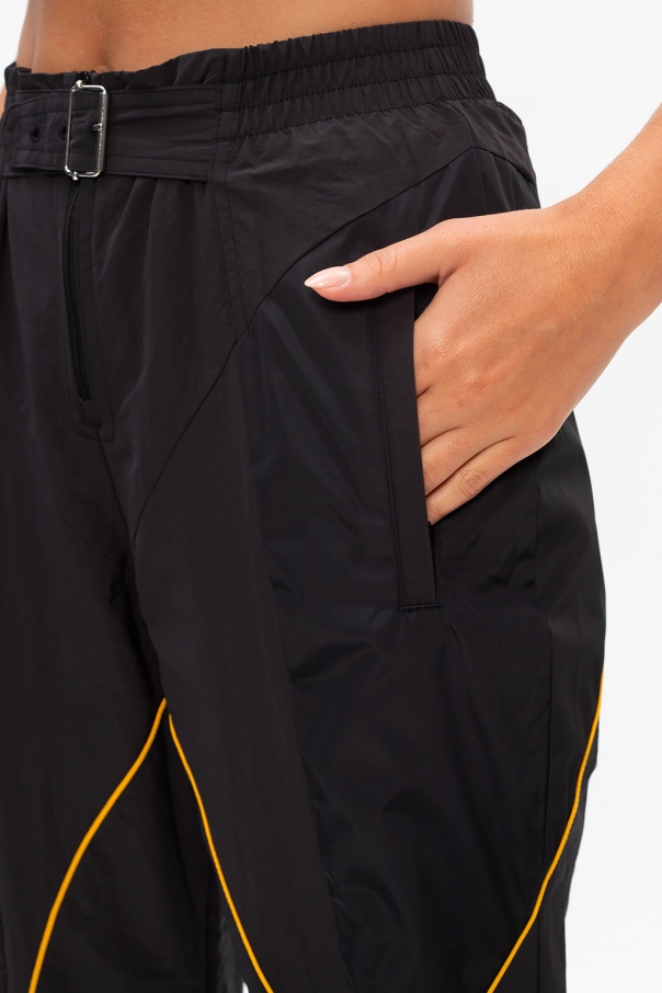 Black and yellow track pants from ADIDAS Originals x Paolina Russo. Sporting rubberised tactile white logo detail on the back, this pair is complete with zip fly, buckled belt, two zipped pockets on the front and elasticated leg openings with velcro closures.