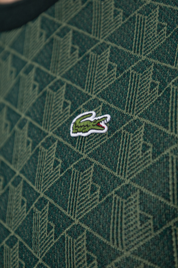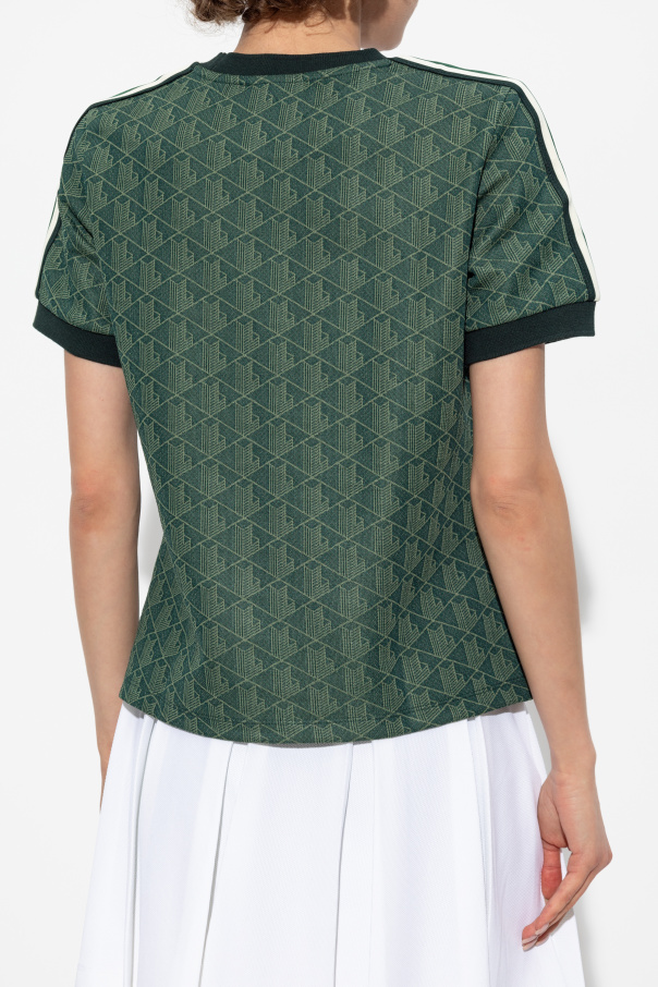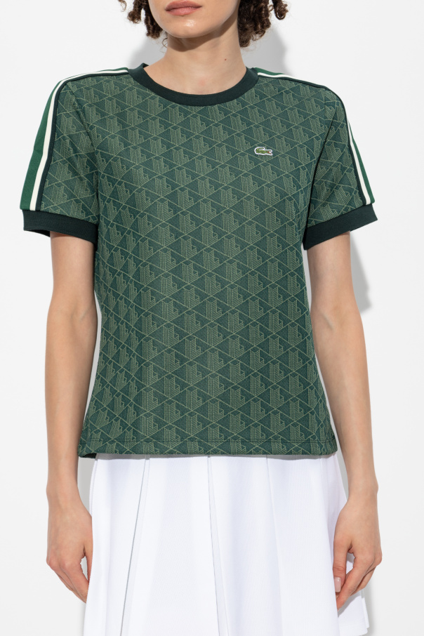 Introducing the Monogram T-shirt from the exclusive collection by Lacoste, a brand synonymous with luxury and prestige. Crafted from a dense fabric blend, this elegant green T-shirt showcases a geometric pattern of minute, repeating shapes, exuding sophistication. Featuring a small, embroidered crocodile logo on the left chest, this piece embodies the hallmark of Lacoste's exquisite attention to detail. Contrasting black ribbed trim at the neckline and sleeve cuffs add a touch of refinement, while the parallel white stripes along the shoulders infuse a sporty flair. The classic straight cut gently hugs the body, offering both comfort and freedom of movement. Ideal for athletic pursuits or casual ensembles, this women's T-shirt pairs beautifully with a white pleated skirt for a chic, sporty look. Presented in a versatile style, the Monogram T-shirt epitomizes high-quality craftsmanship and timeless elegance, making it a staple for any refined wardrobe. Why choose this product? Elegant Design: Intricate geometric pattern and luxurious green hue. Signature Details: Embroidered crocodile logo and contrasting trims. Versatility: Perfect for both athletic and casual wear. Comfortable Fit: Classic cut ensures comfort and ease of movement. Heritage Brand: From the renowned Lacoste, blending French sport heritage with modern style.