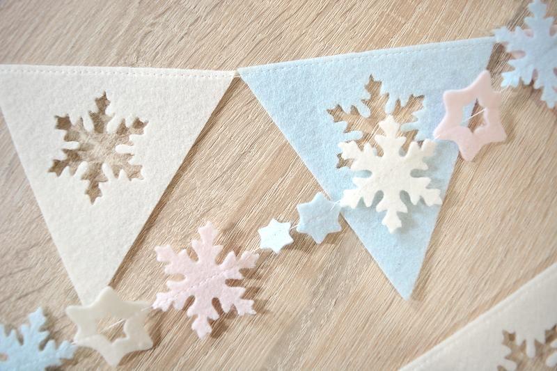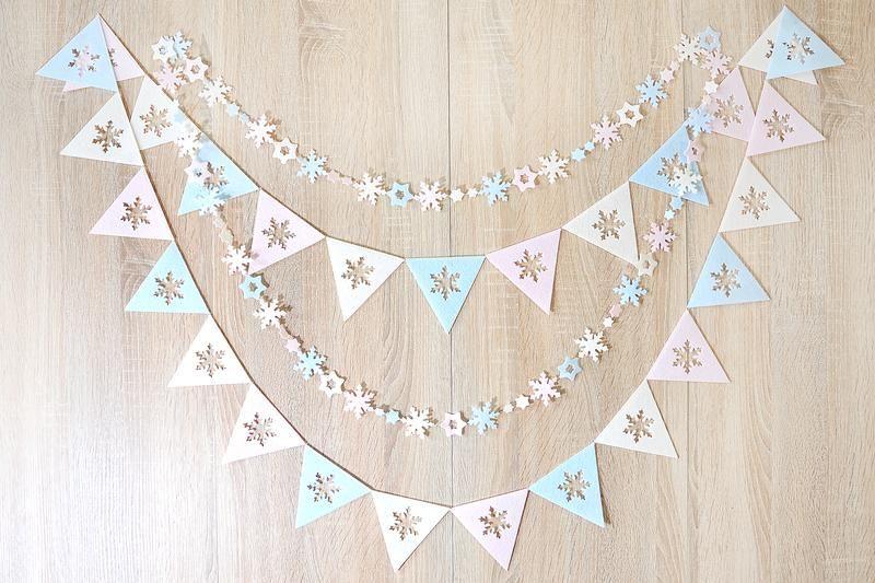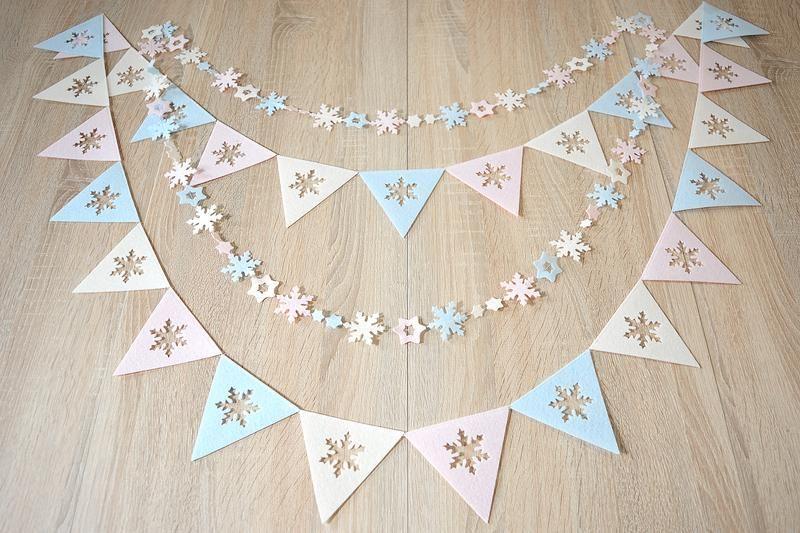1) Великі трикутники розміром 10 см, з вирізаною всередині сніжинкою, 27 штук. Довжина гірлянди 280 см.