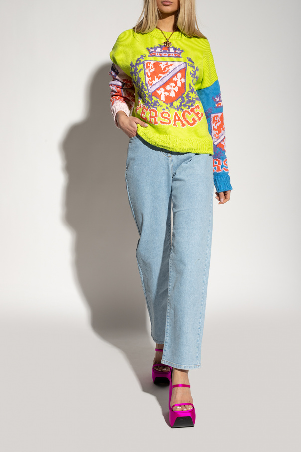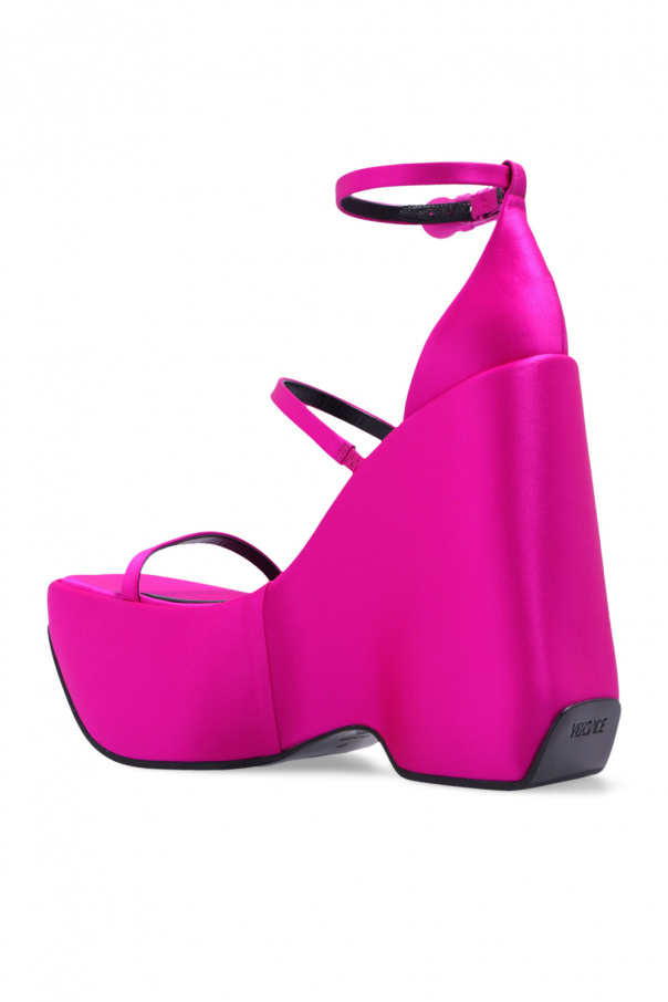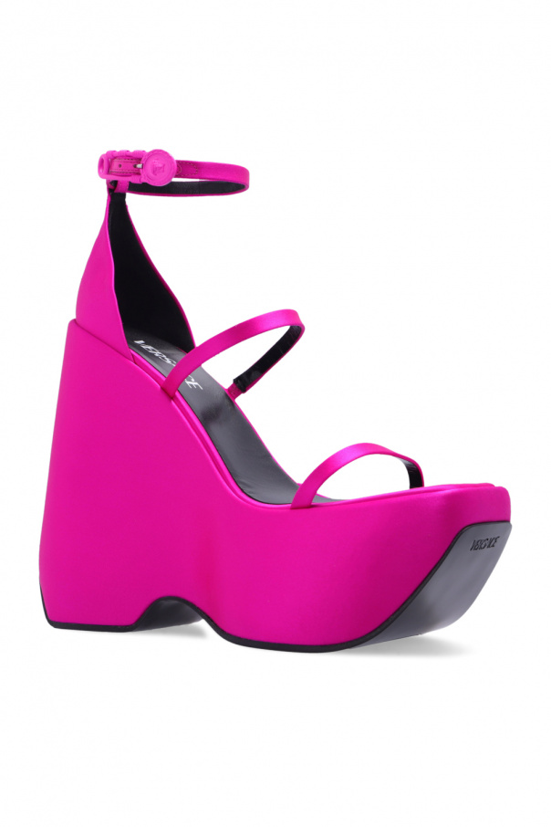 Pink ‘Triplatform’ sandals from Versace. Made of satin, this pair features ankle straps with a safety pin and Medusa head, this pair features an embossed logo, square toe and black sole made of leather and rubber.
