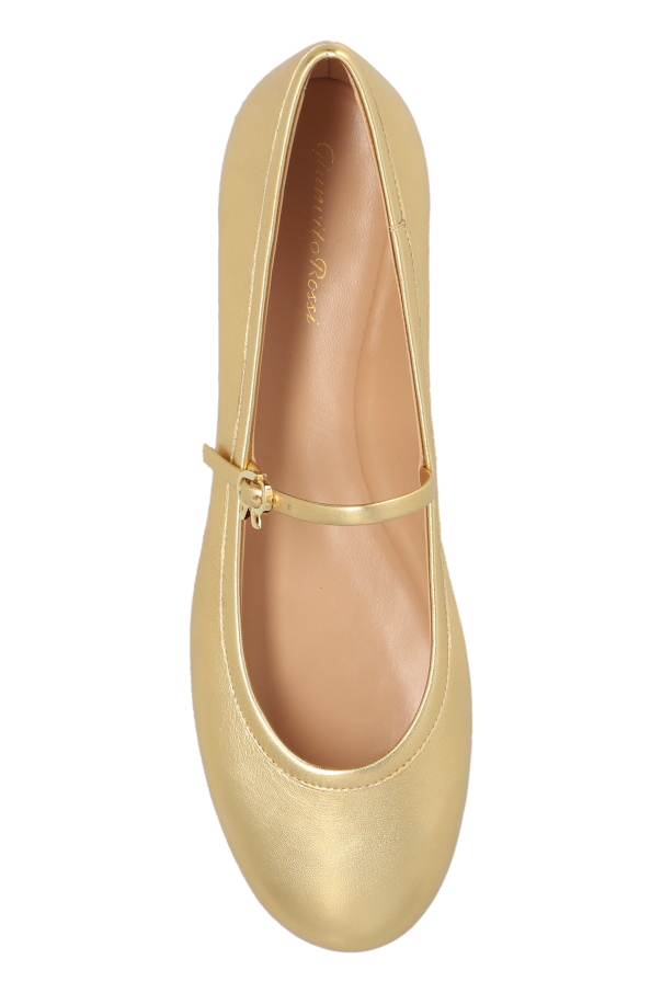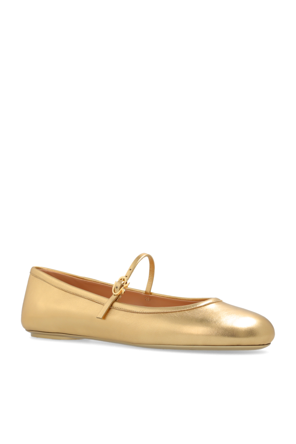 Introducing the exclusive Carl Ballet Flats from the renowned designer Gianvito Rossi. These sophisticated shoes epitomize elegance and minimalist design. They feature a classic shape with a rounded toe and a low profile typical of ballet flats. Made from shiny gold material, they perfectly complement a variety of outfits. The interior of the shoe, lined with smooth beige leather, guarantees the highest comfort of wear. A subtle strap across the instep, fastened with a small gold buckle featuring the designer's delicate logo, adds charm and ensures a better fit to the foot. The flat rubber sole provides comfort and stability throughout the day. Why should you buy this product? Elegant and minimalist design High-quality materials – leather and rubber Exclusive look thanks to the gold color Functional strap with buckle for better fit Perfect for everyday wear and special occasions