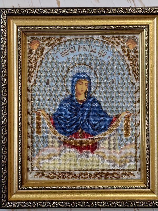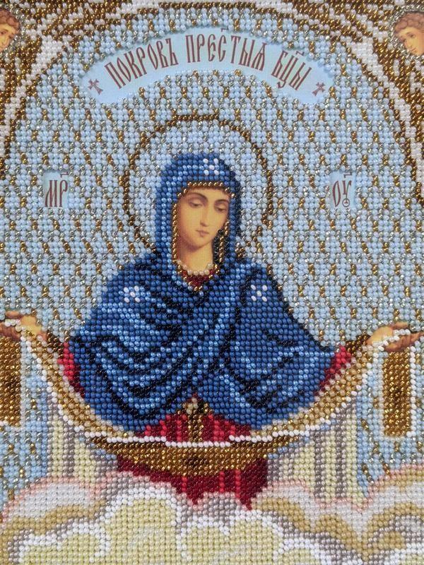 Икона Покров Пресвятой Богородицы вышита бисером.