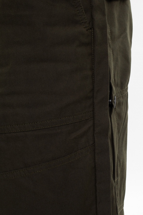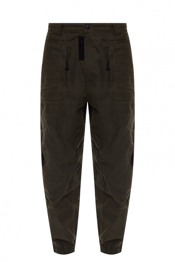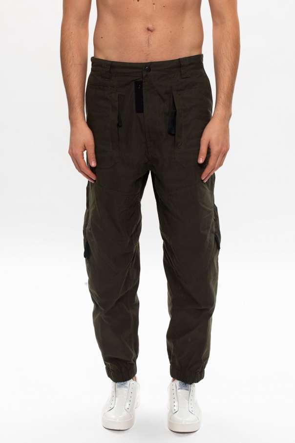 Dark green ‘P-Jarrod’ trousers with pockets from Diesel. Fastened with a zip and snap, this straight leg design features an embroidered logo pattern in black, ribbed cuffs as well as three slip pockets, four zip pockets, two snap-fastened flap pockets and two slip pockets on the sides.