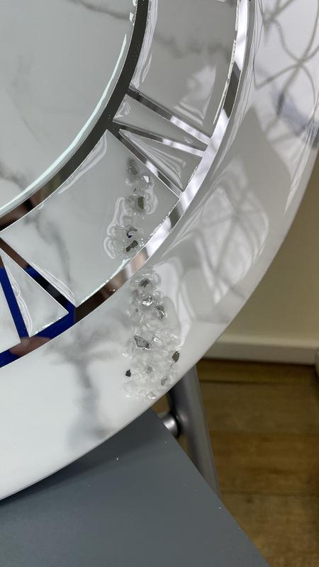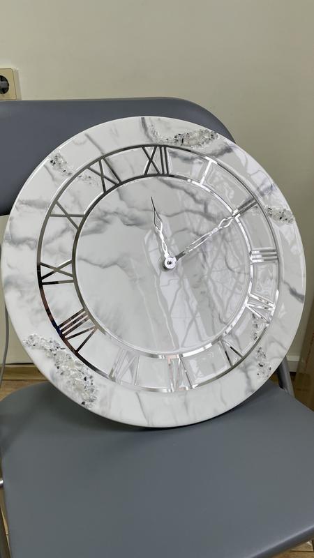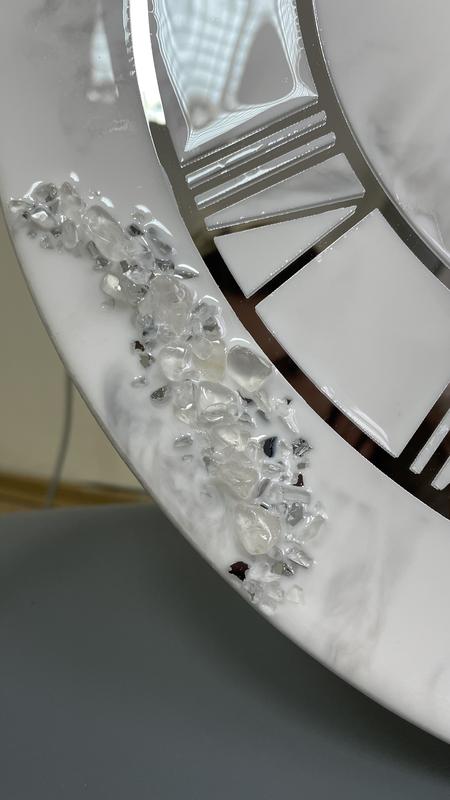 Прекрасные часы из эпоксидной смолы. Полностью ручная работа. Создан с эффектом под мрамор. Имеет интересный циферблат. Украшен натуральными камнями (горский хрусталь).