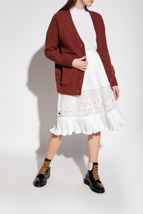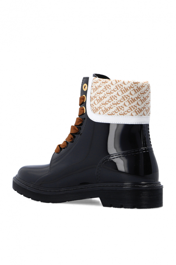 Black ‘Florrie’ rain boots from See By Chloé. Sitting on a black rubber sole, this model features gold-tone metal hardware and a cream and white insert printed with a light beige logo.