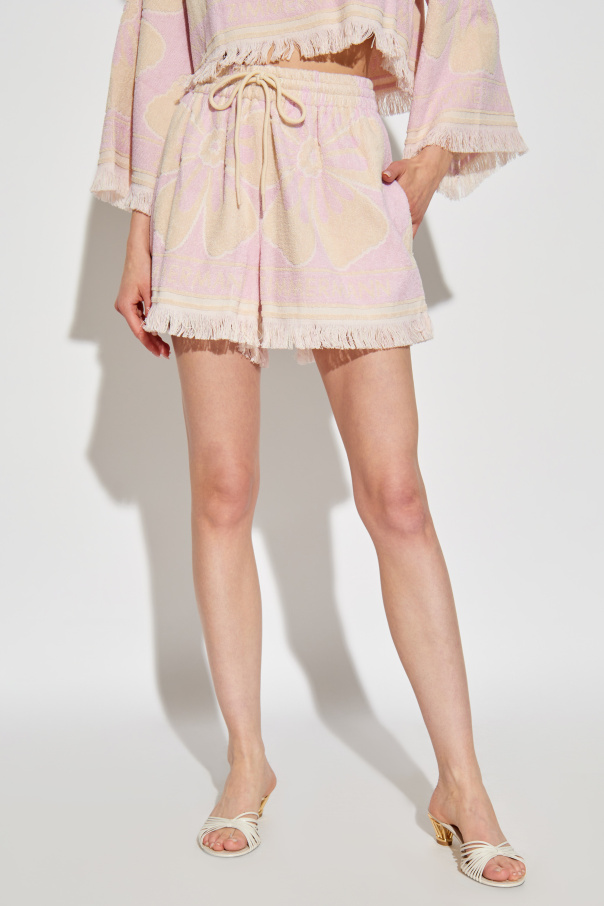 Introducing a quintessence of summer luxury, the Zimmermann Beach Shorts crafted from the finest 100% cotton terry cloth. These shorts are a harmonious blend of opulence and casual beach flair, designed to cater to the discerning tastes of those who appreciate high-end fashion. The vibrant pink hue, complemented by a subtle cream undertone, encapsulates a warm, summer palette, making these shorts a perfect choice for sun-drenched days. The shorts boast a distinctive, large pattern that evokes floral motifs or abstract shapes, resonating with the aesthetics of exclusive designers. This design is not just visually appealing but also adds a touch of artistic sophistication to your beachwear. Accentuated with fringes on the lower edge of the legs, they exude an informal, beach-ready vibe. The terry cloth material, known for its comfort and quick-drying properties, enhances the functionality of these shorts, making them both a stylish and practical choice for seaside escapades. Adjustability is key; hence, the waist is equipped with a drawstring, allowing for a customizable fit. Side pockets add an element of convenience, ensuring your essentials are within reach. The texture of the material, reminiscent of a high-quality towel, is visible up close, highlighting the craftsmanship and attention to detail that characterizes Zimmermann's creations. Why purchase this product? Luxurious 100% cotton terry material, offering both comfort and style. Exclusive, eye-catching design with a vibrant color palette. Drawstring waist and side pockets for functionality and convenience. Beach-ready with quick-dry features and informal fringe detailing.