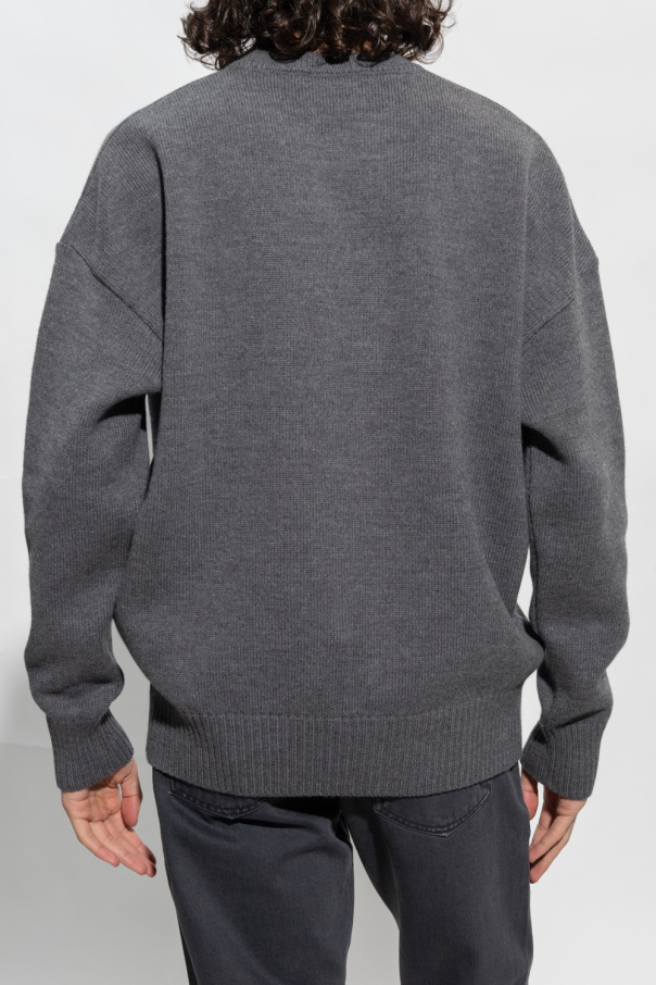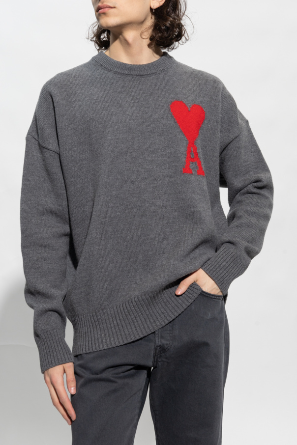 Grey crewneck sweater from Ami Alexandre Mattiussi. Crafted from wool, this style showcases a red graphic pattern with the brand's logo, long sleeves and ribbed trims on the collar, bottom hem and cuffs.