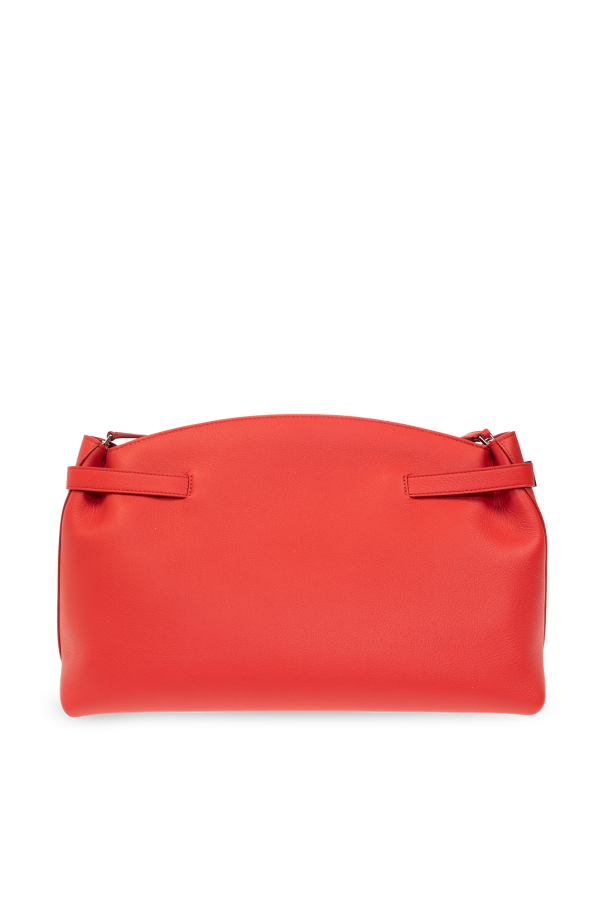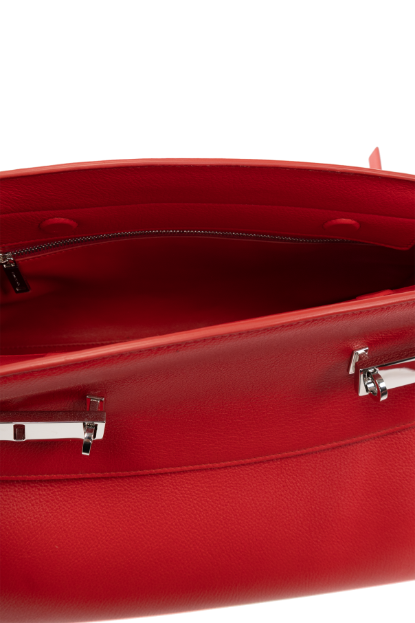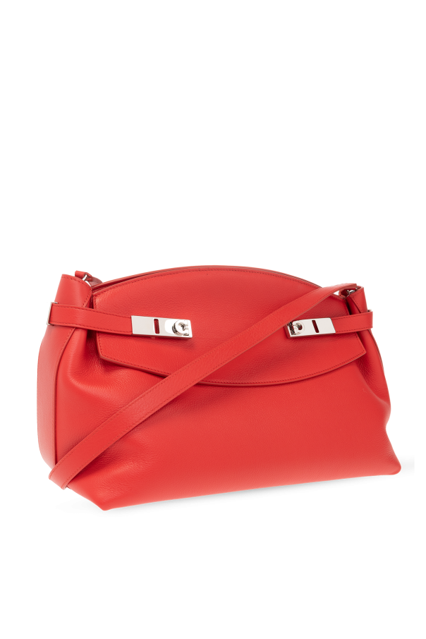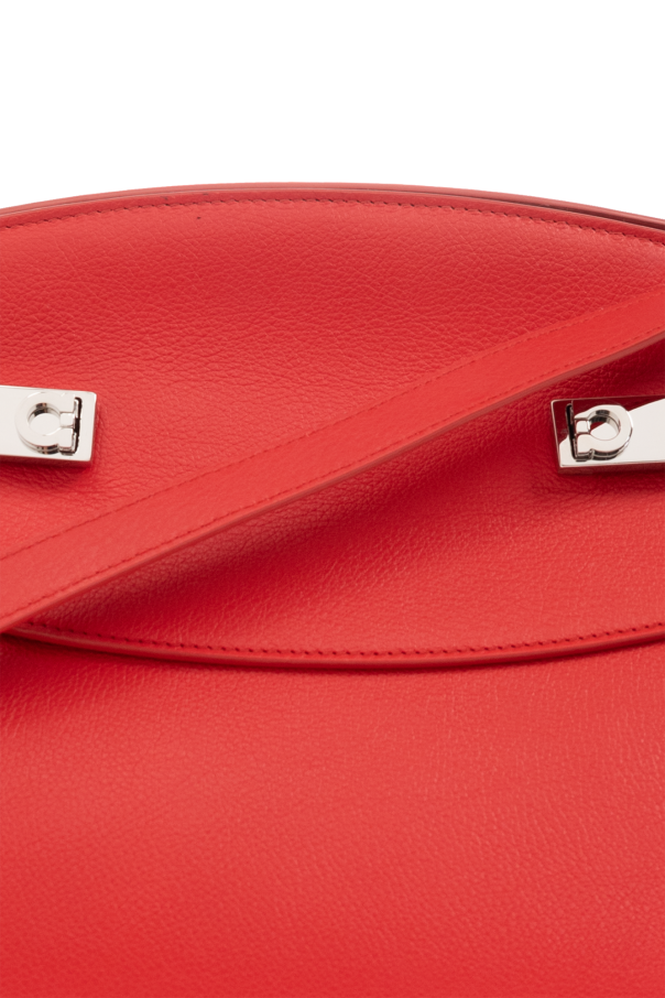 Red ‘Hug’ shoulder bag from FERRAGAMO. Made from grained calf leather, this design secures with magnetic fasteners and showcases an embossed gold-tone logo on the side and distinctive straps accentuated with ‘Gancini’ hardware on the front. It is complete with a detachable and adjustable shoulder strap, silver-tone metal elements and one internal compartment with a zip pocket.
