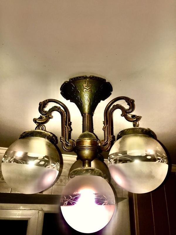 Люстра зроблена в СРСР (справжній мідь і якісне скло), на 4 лампочки. Під'єднання — 4 лампочки — одинарний вимикач. Плафони — кулі — матові. Патрони — кераміка. Все ціле. Усі плафони є! Робоча. Має красивий вигляд.
