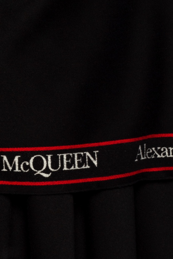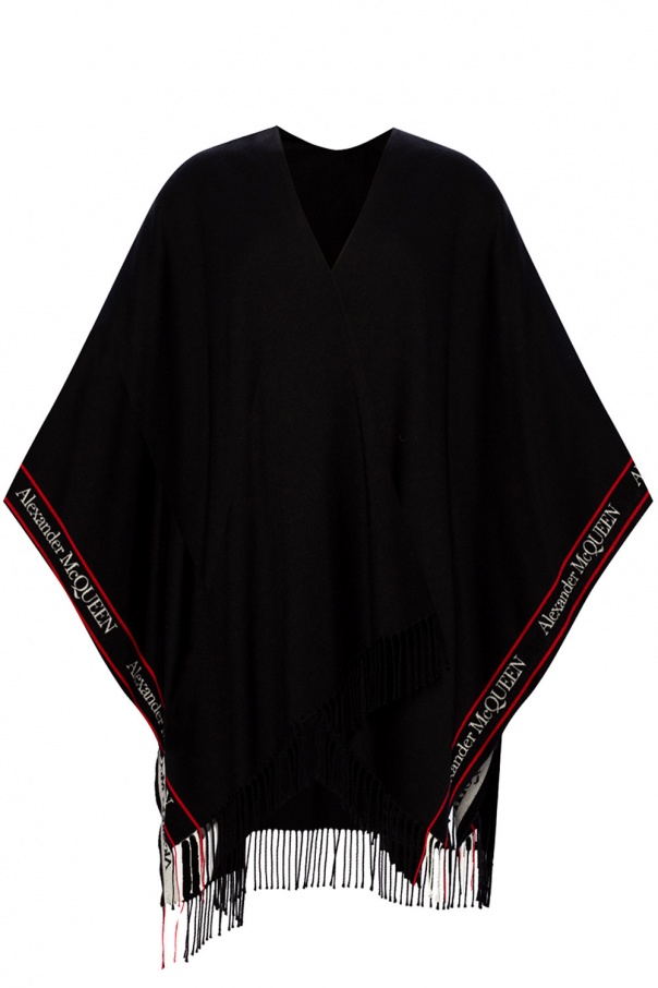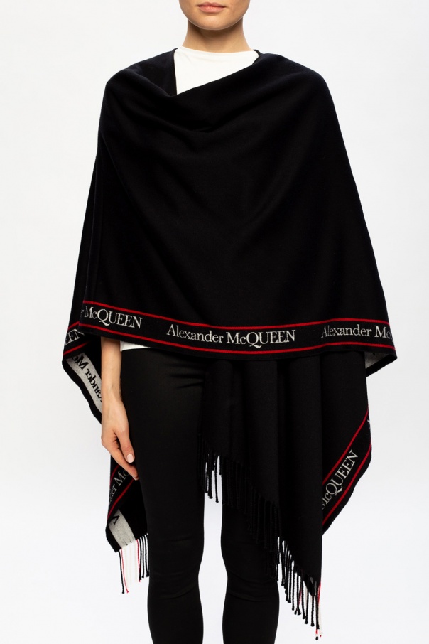 Beige, red and black poncho from Alexander McQueen. Made of a wool and cashmere blend, this garment is enriched with a logo embroidery and fringes.