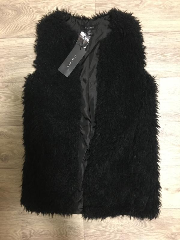Очень модная жилетка фирмы AMISU,есть карманы,застигается на крючки,тёплая,выглядит намного круче,чем на фото,