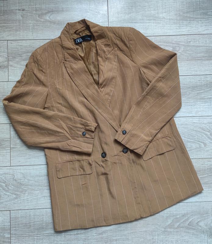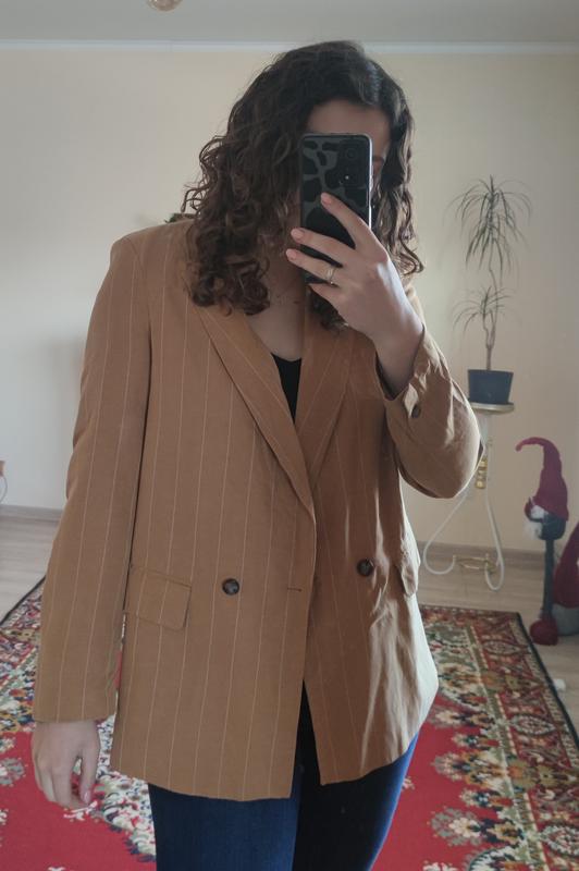 Двубортный коричневый/карамельный прямой оверсайз пиджак, жакет, блейзер в полоску в размере М, но подойдет на S/L от бренда Zara. Имеет V-образный вырез горловины с лацканами, подплечники и подкладку. Ткань бирка срезана, но в составе есть хлопок, материал гладкий, плотный, приятный к телу. Стан нового. Замеры: