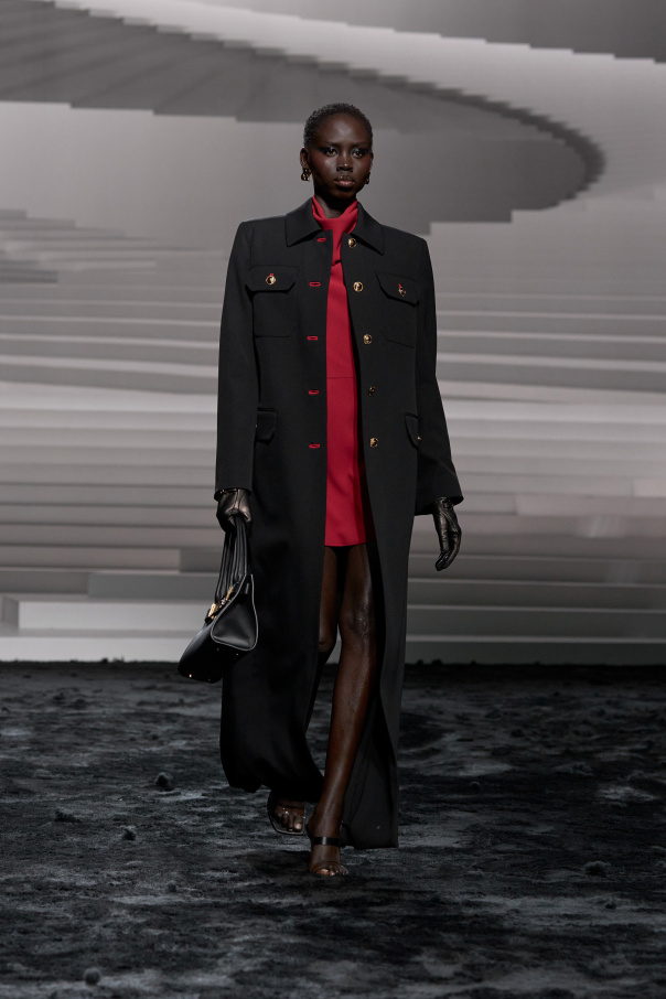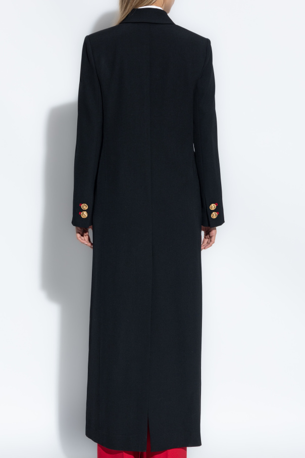 Introducing the Wool Coat by Versace, an epitome of luxury and elegance. Crafted from the finest wool, this black long coat embodies timeless sophistication with its classic collar and exquisite tailoring. The coat is adorned with gold buttons featuring red accents, adding a touch of unique charm to its refined silhouette. Designed with practicality in mind, the coat features four flap pockets—two on the chest and two at the hips—each secured with buttons for added security. The back of the coat is simple yet stylish, incorporating a subtle slit at the hem to ensure ease of movement. This masterpiece is a testament to Versace's unparalleled creativity, blending Italian tradition with modern innovation. A brand synonymous with distinctive style and individual empowerment, Versace continues to lead the fashion industry with its iconic designs. Why Choose This Product? Exquisite wool material ensuring comfort and warmth Distinctive gold buttons with red detailing for a unique flair Practical design with four functional pockets Timeless and versatile style suitable for any occasion Crafted by the renowned brand, Versace