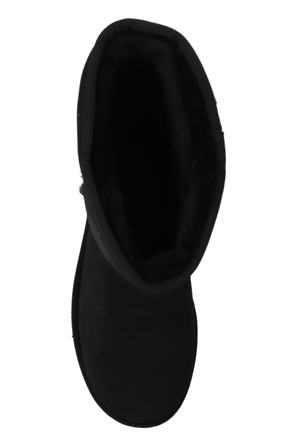 Introducing the Classic Tall II snow boots, an exquisite addition to our exclusive collection of winter apparel. These sophisticated black boots are designed to reach mid-calf, featuring a timeless and minimalist silhouette that exudes elegance. Meticulously crafted from luxurious suede leather, the exterior of these boots showcases distinct stitching, adding a subtle yet refined touch. The interior is lined with plush, warm shearling, ensuring unparalleled comfort and warmth during the coldest of winter days. The sturdy rubber sole provides excellent grip and insulation, making these boots not only stylish but also highly functional. The boots boast the iconic UGG logo at the base of the shaft, a testament to the brand's heritage of quality and craftsmanship. With their sleek, slip-on design, the Classic Tall II boots are a quintessential choice for those who appreciate both fashion and practicality. Why choose the Classic Tall II? Elegant Design: A classic, chic look that complements any winter ensemble. Premium Materials: Crafted from luxurious suede leather and lined with cozy shearling. Exceptional Comfort: Soft, warm interior ensures maximum comfort. Durable Construction: Robust rubber sole provides excellent grip and insulation. Iconic Branding: Features the distinctive UGG logo, symbolizing heritage and quality.