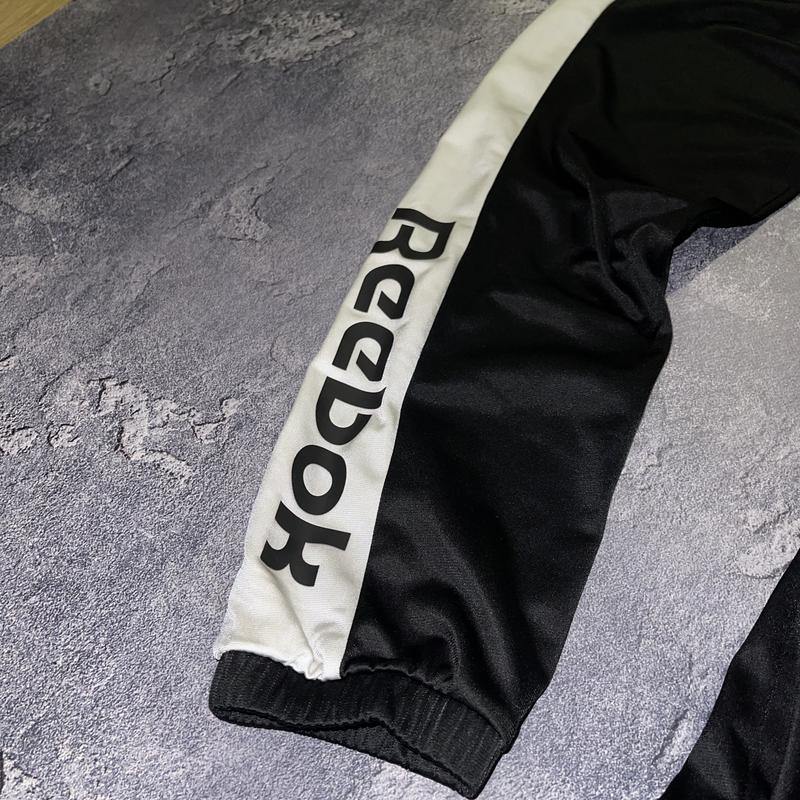 Черные брюки от Reebok, размер S. Справа снизу расположена горизонтальная надпись Reebok, а слева – логотип Reebok. По бокам брюки выглядят белоснежными вставками, придающими стильный вид. Изготовлены из приятного на ощупь материала из новых коллекций, что делает их идеальными для повседневной носки или тренировок.