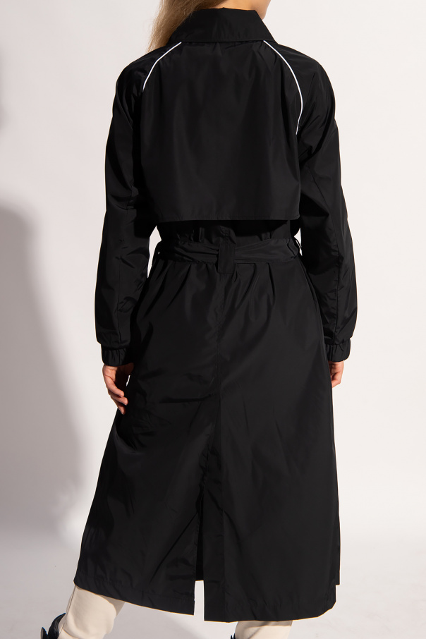 Black coat from ADIDAS Originals, the ‘Primegreen’ line. Fastened with snaps, this design features a tie waist, white logo embroidery, the label’s signature three stripes, two snap-fastened flap pockets and ribbed cuffs. ‘Primegreen’ is a line that uses recycled materials in the production of high-quality products.