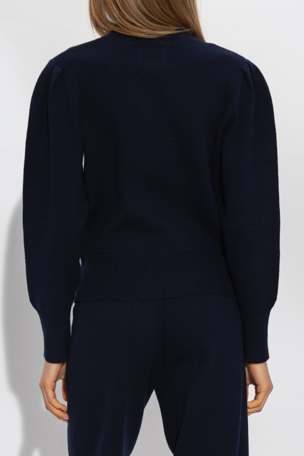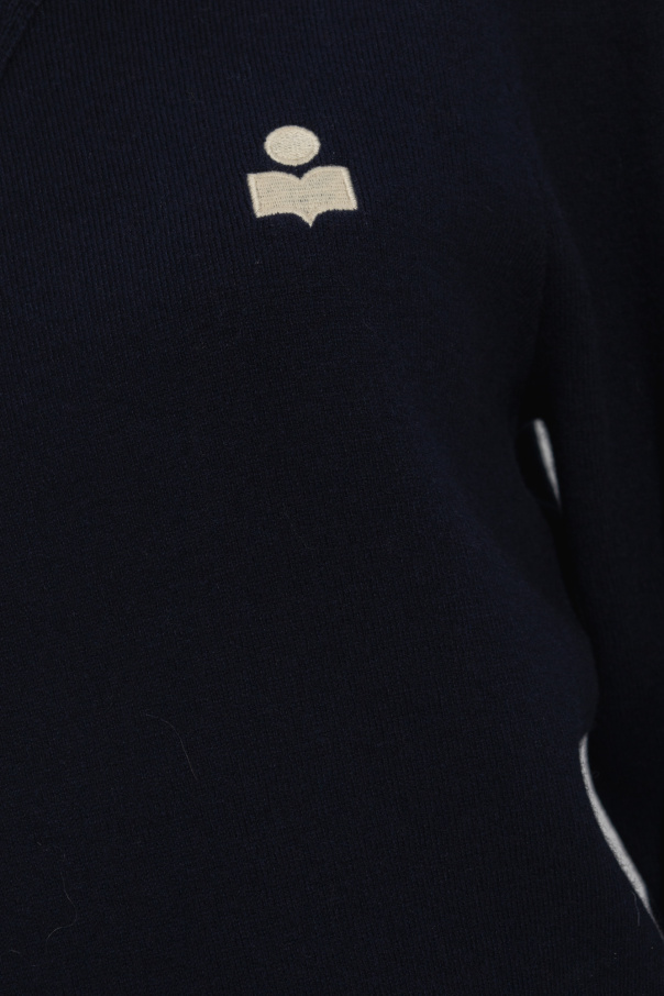 Navy blue ‘Kelaya’ sweater from Marant Etoile. Made of a cotton and wool blend, this style is embellished with a sewn-on cream logo graphic and features long sleeves and ribbed trims on the round neck, bottom hem and cuffs.