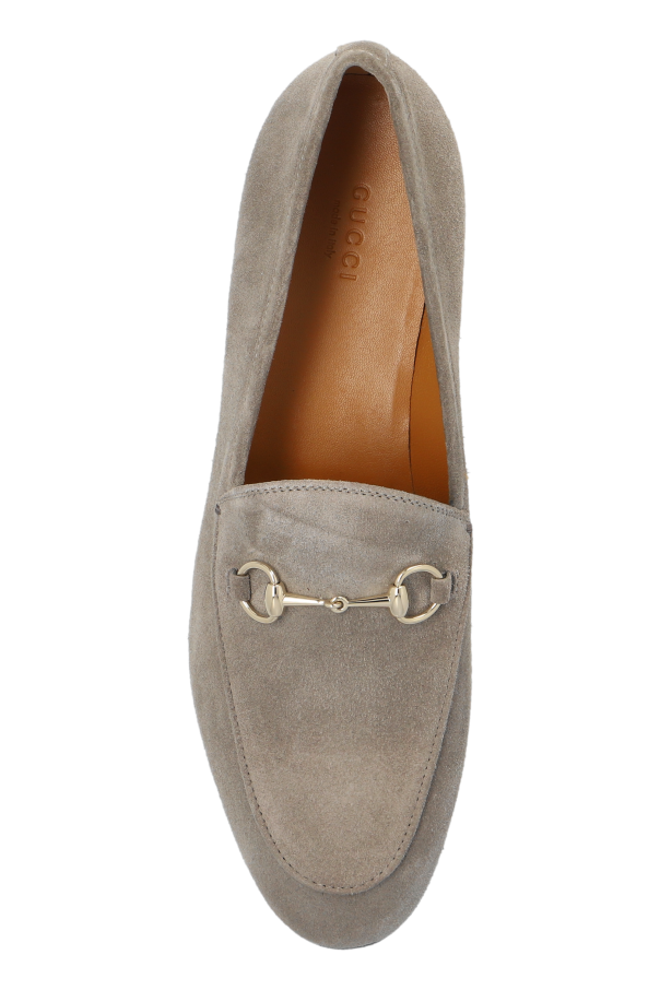 Introducing the exquisite Jordaan Leather Loafers, a testament to refined craftsmanship from the lauded house of Gucci. These luxurious women's shoes feature a classic loafer silhouette with a rounded toe, meticulously crafted from premium suede leather, offering both elegance and durability. Embodying understated sophistication, the loafers are rendered in a timeless gray hue. The design is accentuated by a distinctive metal horsebit detail on the vamp, a signature embellishment synonymous with the brand's opulent aesthetic. The interior is lined with supple leather, ensuring unparalleled comfort with every step. Why Choose This Product? Expertly crafted from high-quality suede leather Classic loafer design with a rounded toe Elegant gray color, perfect for versatile styling Signature metal horsebit detail for a touch of luxury Leather-lined interior for superior comfort