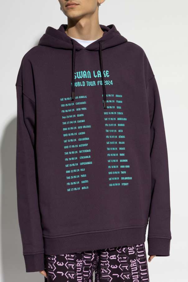 Introducing the Versace Jeans Couture Exclusive Hoodie in a stunning shade of purple. This hoodie epitomizes luxury and contemporary streetwear, crafted from the finest cotton for unparalleled comfort and durability. The oversized fit ensures a relaxed silhouette, complemented by a round neckline and an adjustable hood with drawstrings. The front boasts a striking turquoise print listing cities and dates, evoking an exhilarating World Tour Fall 2024 theme inspired by the iconic "Swan Lake." On the back, a captivating graphic of a swan accompanied by the text "Swan Lake World Tour 2024" adds an artistic touch. Though the designer's logo is subtly integrated, the meticulous craftsmanship and distinctive style unmistakably mark this piece as a creation of Versace Jeans Couture. Why Choose This Product? Exquisite Design: Unique prints and graphics that stand out. Premium Material: Made from 100% high-quality cotton. Comfort and Style: Oversized fit for a modern, streetwear look. Versatility: Perfect for everyday wear or making a fashion statement.