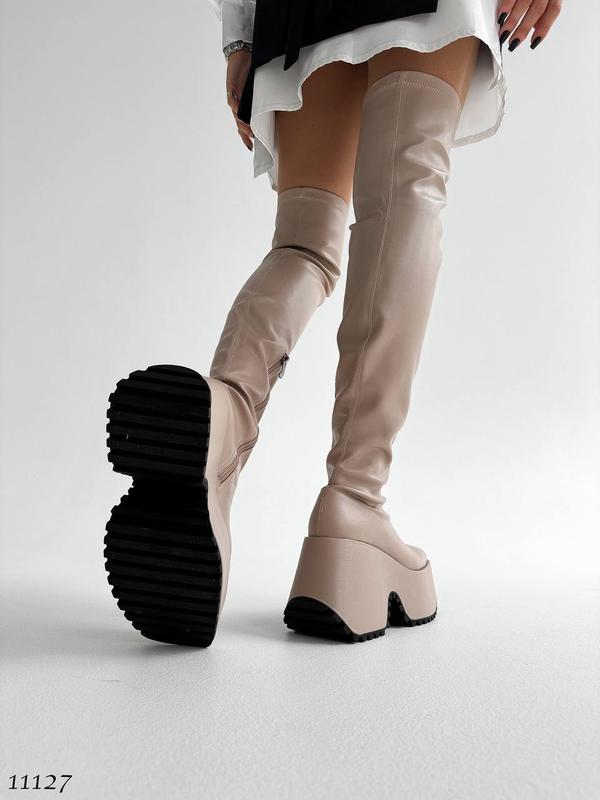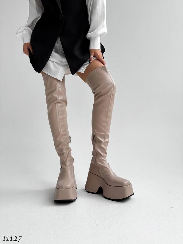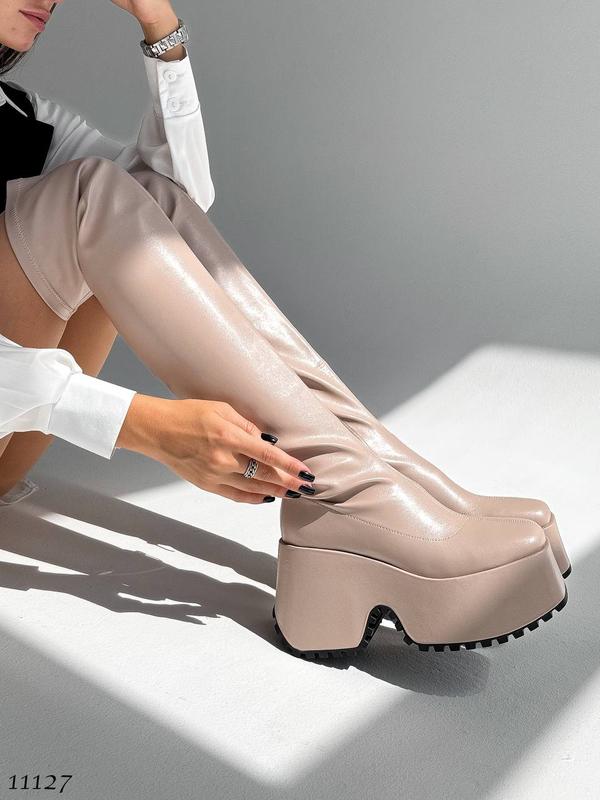 Жіночі бежеві ботфорти на платформі демісезонні демі чоботи панчохи на флісі еко-шкіра