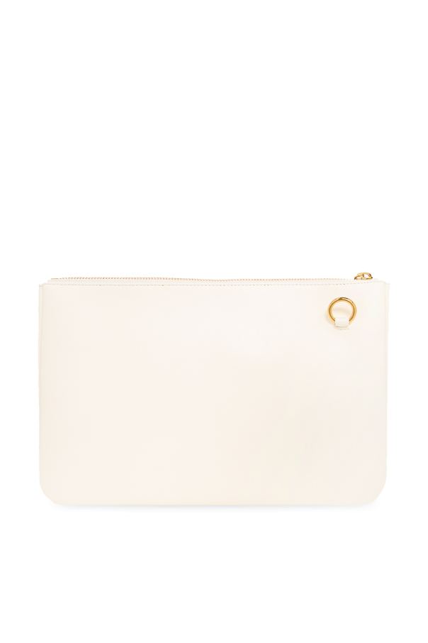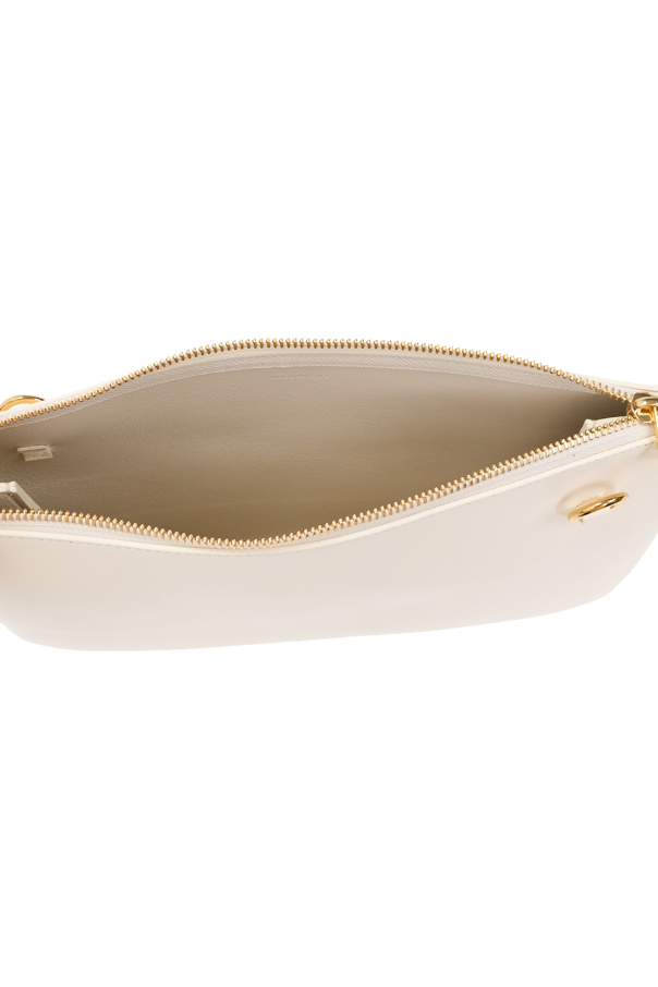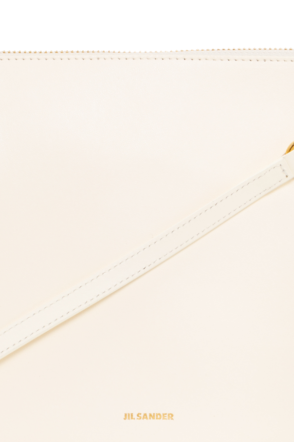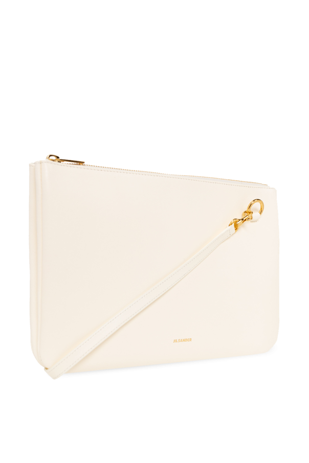 White clutch from Jil Sander. Made of lamb leather, this model features a gold-tone logo print, detachable half-round handle, detachable and adjustable shoulder strap, one internal compartment and gold-tone metal hardware.