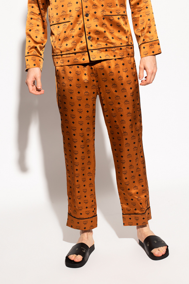 Brown and black pyjama bottoms from MCM. Crafted from silk, this pair features a printed logo pattern, two slip pockets, a drawstring waist and tapered legs.