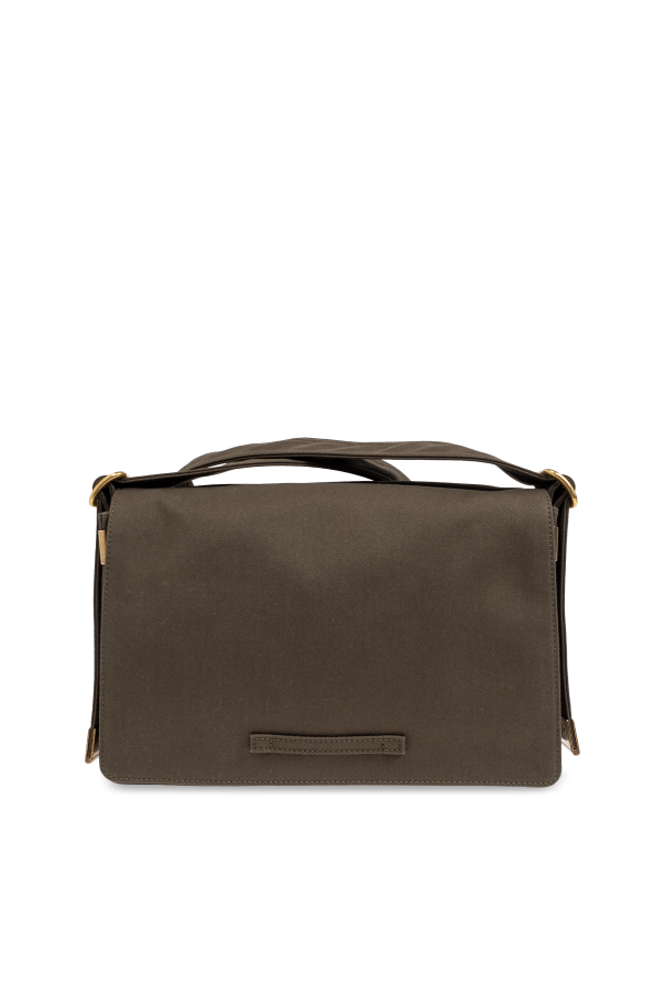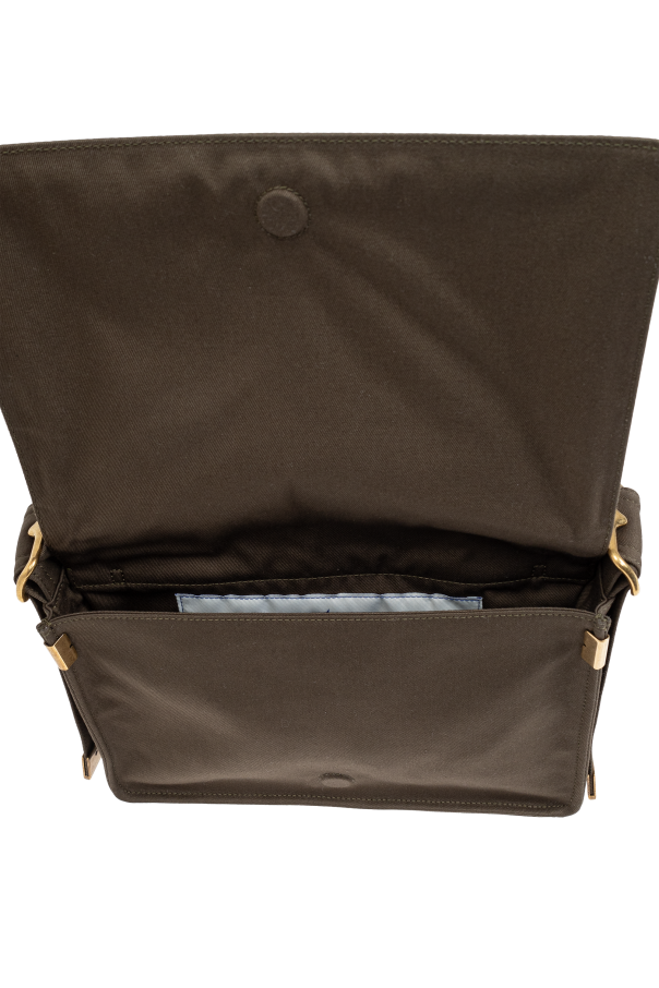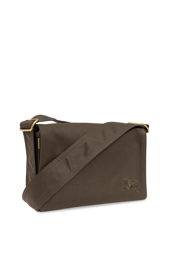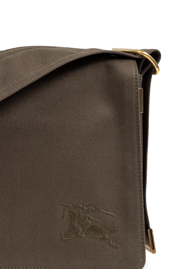Introducing the ‘Trench’ Shoulder Bag by Burberry, a testament to refined aesthetics and functional elegance. Crafted with an eco-conscious blend of 65% recycled polyester and 35% cotton, this bag presents a harmonious marriage of sustainability and style. Its deep green hue, versatile under diverse lighting, exudes an aura of understated luxury, while the smooth texture of its fabric underscores the high-quality craftsmanship inherent to the brand. The bag's rectangular silhouette with rounded corners is devoid of patterns, emphasizing its sophisticated minimalist design. The front features a discreetly embossed logo, signifying its prestigious origins. Functionality is at the forefront, with a wide, adjustable, and detachable shoulder strap, allowing for a tailored fit. Its flap closure, secured by magnetic clasps, safeguards your essentials across two separate compartments and a slip pocket, combining convenience with security. Accentuated with gold or brass-colored metal fittings, the ‘Trench’ Shoulder Bag reflects a blend of durability and elegance, making it a quintessential accessory for the discerning individual. Why Purchase This Product? Eco-Friendly Materials: Made from a blend of recycled polyester and cotton, promoting environmental sustainability. Iconic Design: Burberry’s signature minimalist aesthetic, coupled with functional features and an elegant color palette. Versatile Functionality: Equipped with adjustable components and multiple compartments for organized storage. Luxurious Details: Embossed logo and premium metal accents underscore its exclusivity.