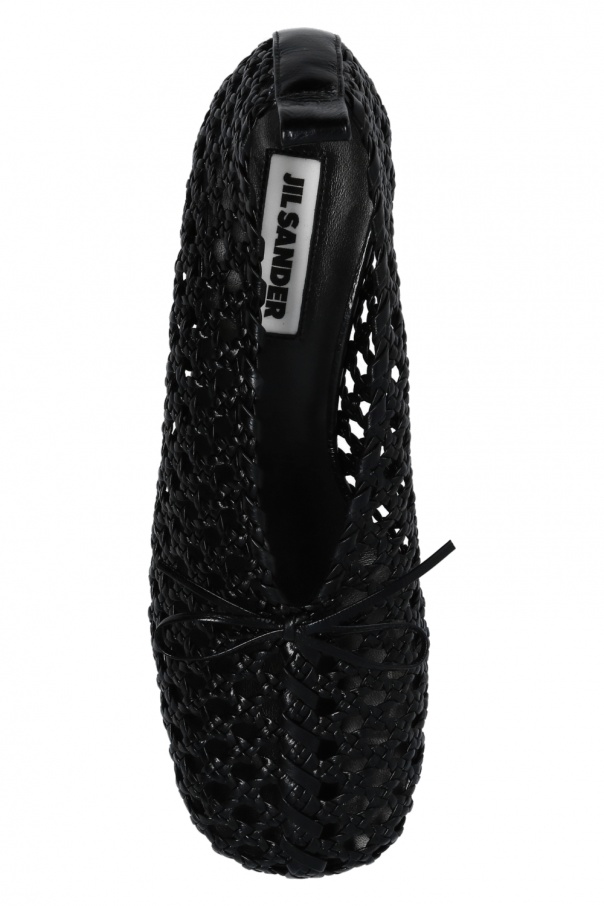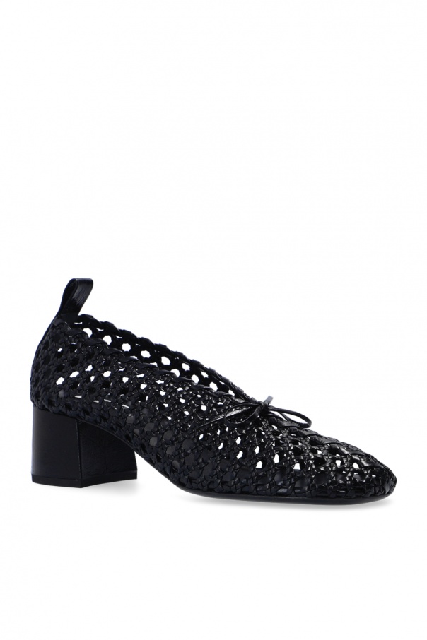 Black woven heeled pumps from Jil Sander. Resting on a black leather sole, this design is decorated with a bow.