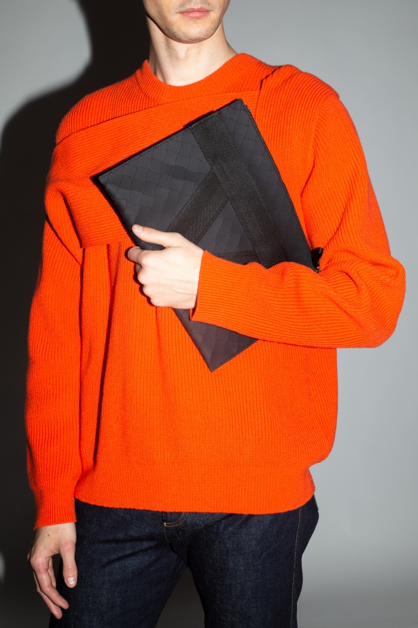 Black document case from Bottega Veneta. Flaunting a lase-engraved ‘Intrecciato’ pattern, this item fastens via a zip and features a black grosgrain strap and one internal compartment with four elasticated bands to secure its content.