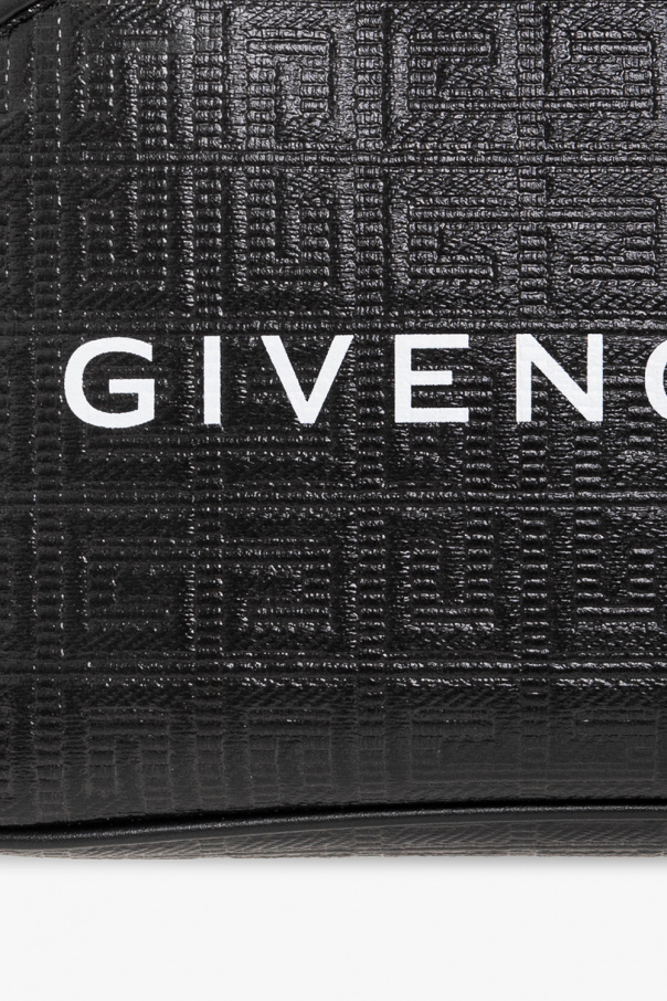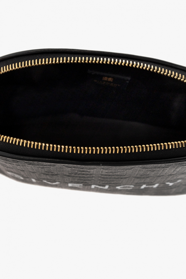 Black wash bag from Givenchy. Crafted from faux-leather, this design showcases an embossed G-Essentials monogram. It is complete with gold-tone metal hardware, a white logo print on the front and one internal compartment.