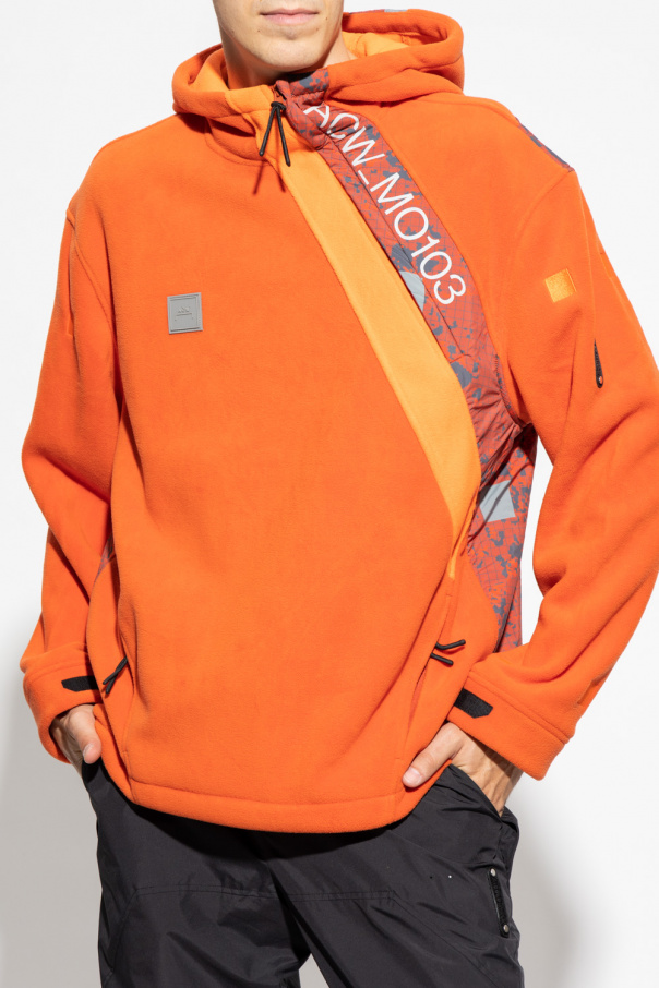 Orange fleece sweatshirt with a hood from A-COLD-WALL*. Emblazoned with a rubber logo patch, this style features a front zipper, decorative checked inserts, a reflective logo print in silver-tone, the brand's signature black patch on the shoulder and long sleeves with velcro adjusters.