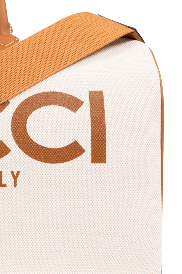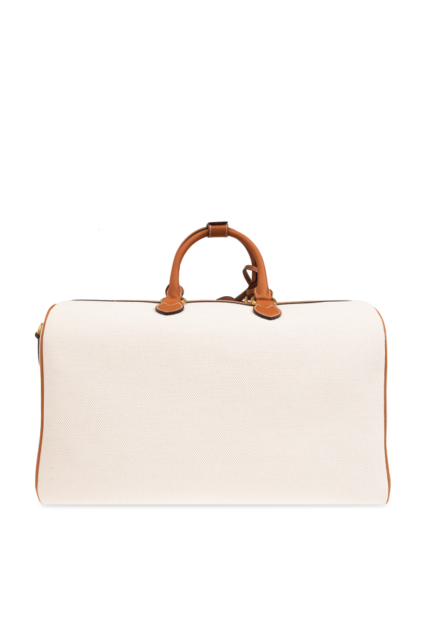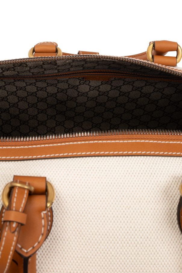 Cream travel bag from Gucci. Made from cotton and linen mix canvas with brown calf lether trims, this model fastens with a two-way zip and is decorated with a logo print. It is complete with a padlock with keys, ID tag, two half-round handles with a snap button, detachable and adjustable shoulder strap, gold-tone metal hardware and one internal compartment with two zip pockets.