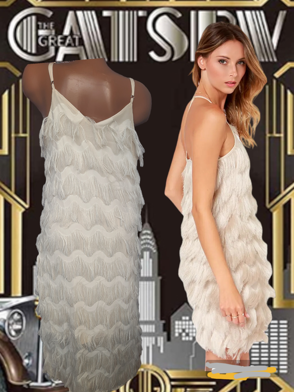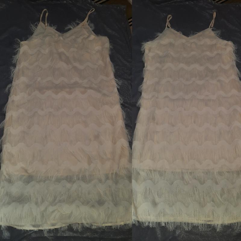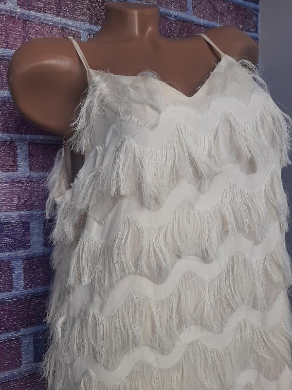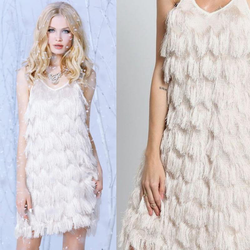 Кремова сукня з бахромою від Shein. Ця весела і гідна сукня-футляр починається з класичного трикутного ліфа, який змінює місце для тканої сітчастої накладки, покритої ярусами м’якої бахроми, яка танцює вниз по ліфу у веселому візерунку шеврон. Тонкі регулюжмі лямки-спагетті