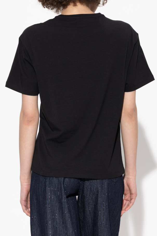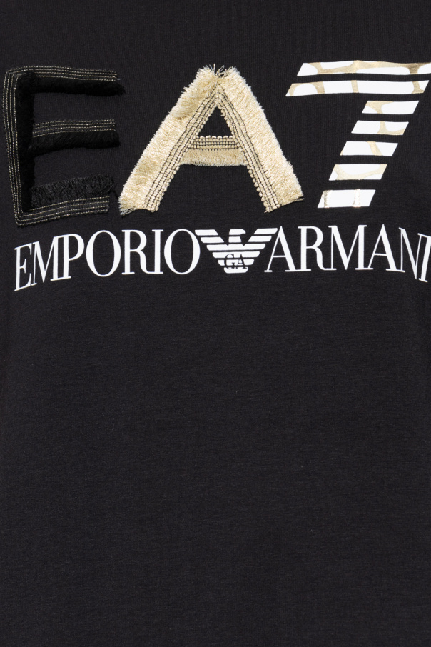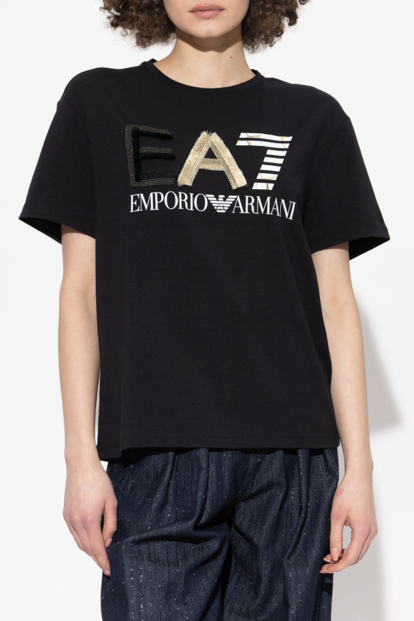 Black crewneck T-shirt from EA7 Emporio Armani. Crafted from a cotton blend, this short sleeve design features a ribbed crew neck as well as a printed and embroidered logo with decorative fringes in black, white and gold-tone.