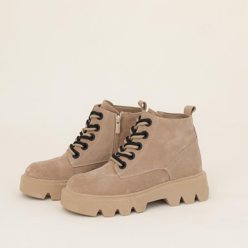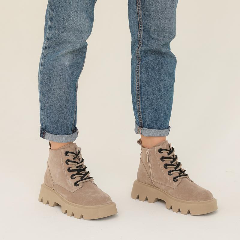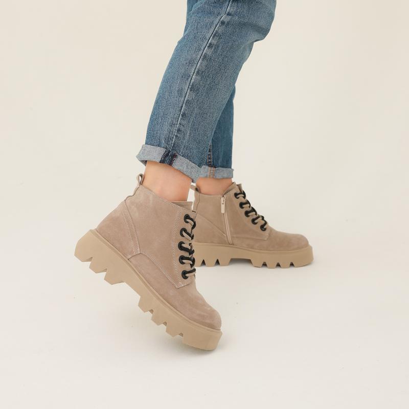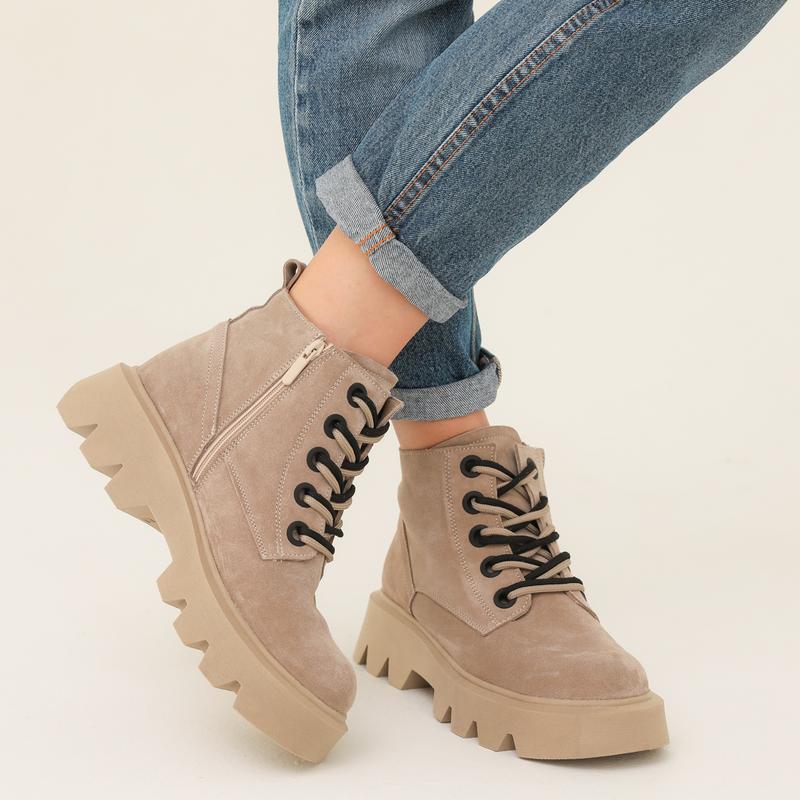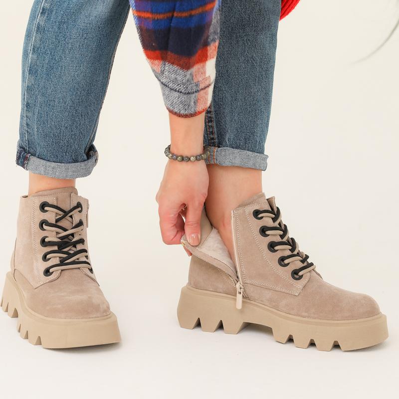 Стильні бежеві жіночі зимові черевики на масивній,високій підошві,пісочні,замшеві з хутром на зиму