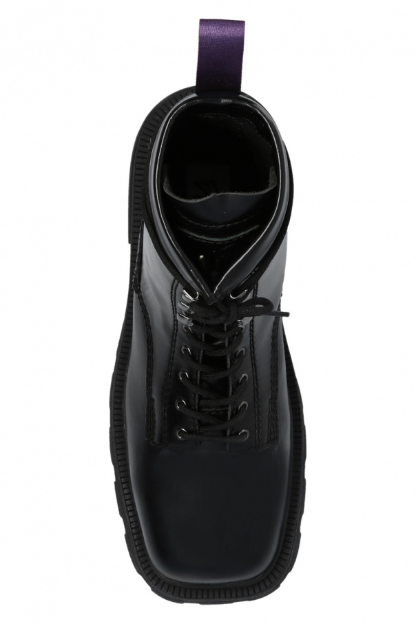 Black ‘Michigan’ ankle boots from Eytys. Crafted from leather, this model features a rubber logo appliqué, purple grosgrain strap at the back and black rubber sole.