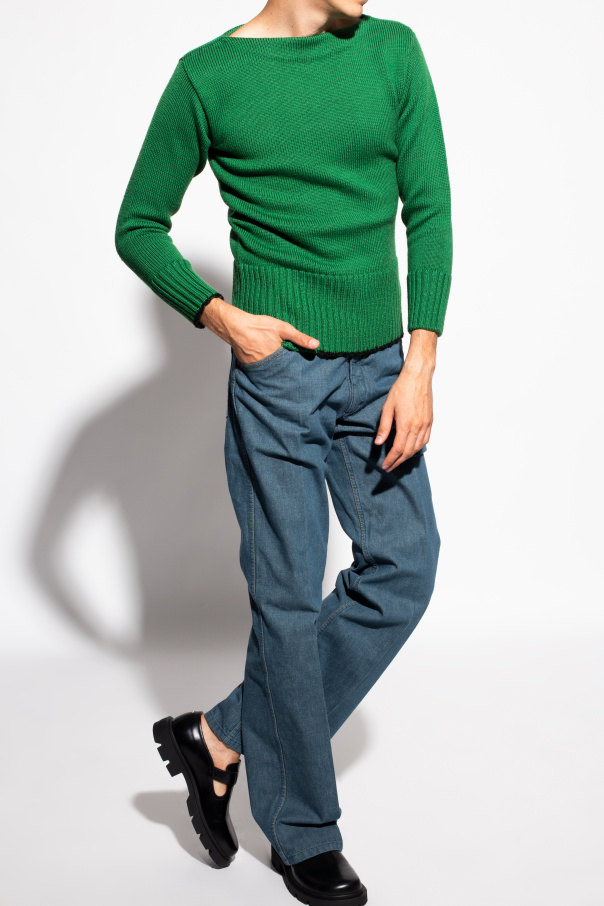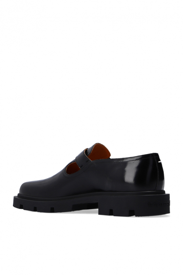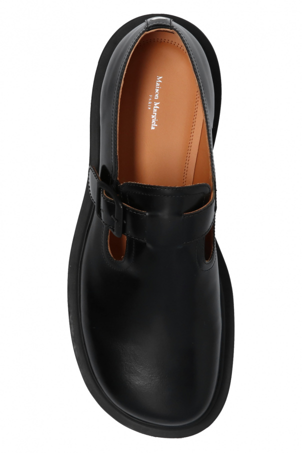 Black shoes from Maison Margiela. Made of leather. Resting on a black rubber sole, this pair features decorative cut-outs and a buckle strap.