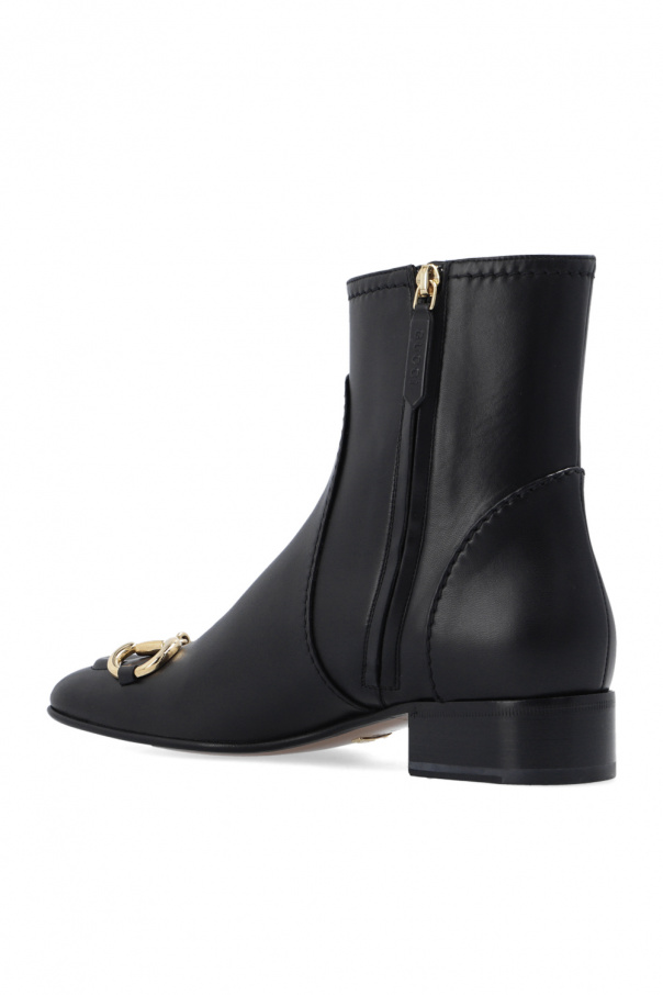Black ‘Charlotte’ ankle boots from Gucci. Crafted from leather, this model sits o na light brown and black leather sole and features a side zip closure, a square toe and gold-tone horsebit hardware on the front.