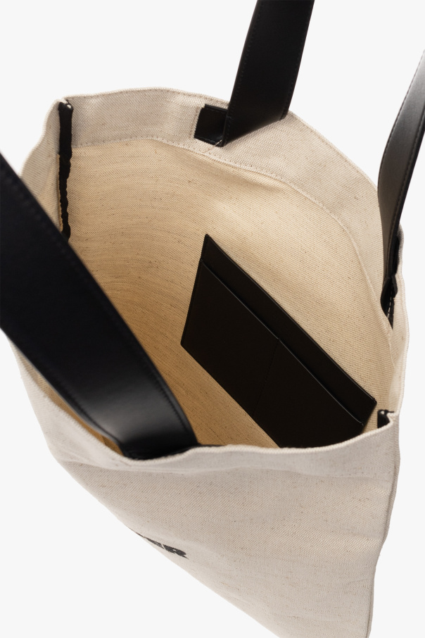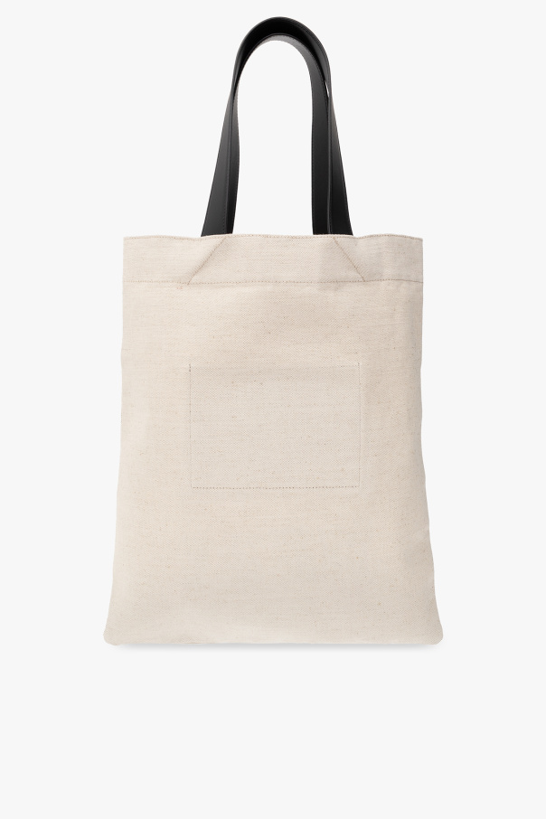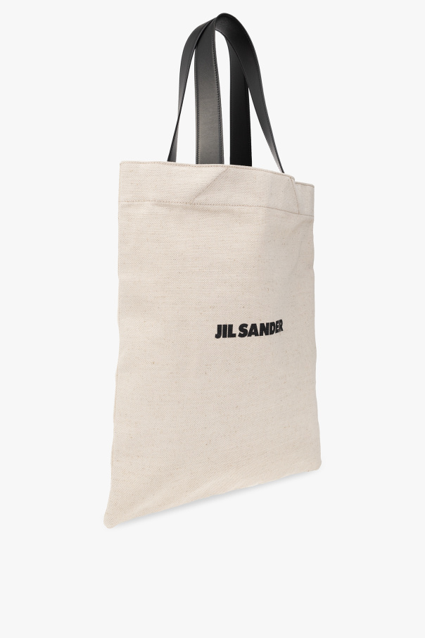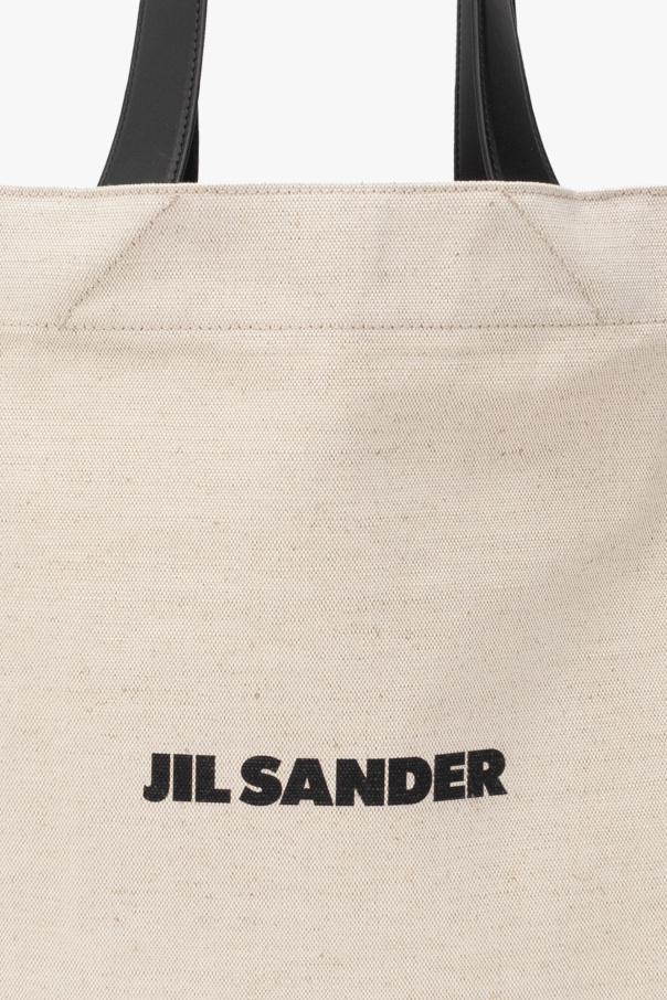 Light beige shopper bag from JIL SANDER. Crafted from a cotton and linen blend, this design showcases a printed black logo on the front, two half-round leather handles and one internal compartment with three slip pockets.