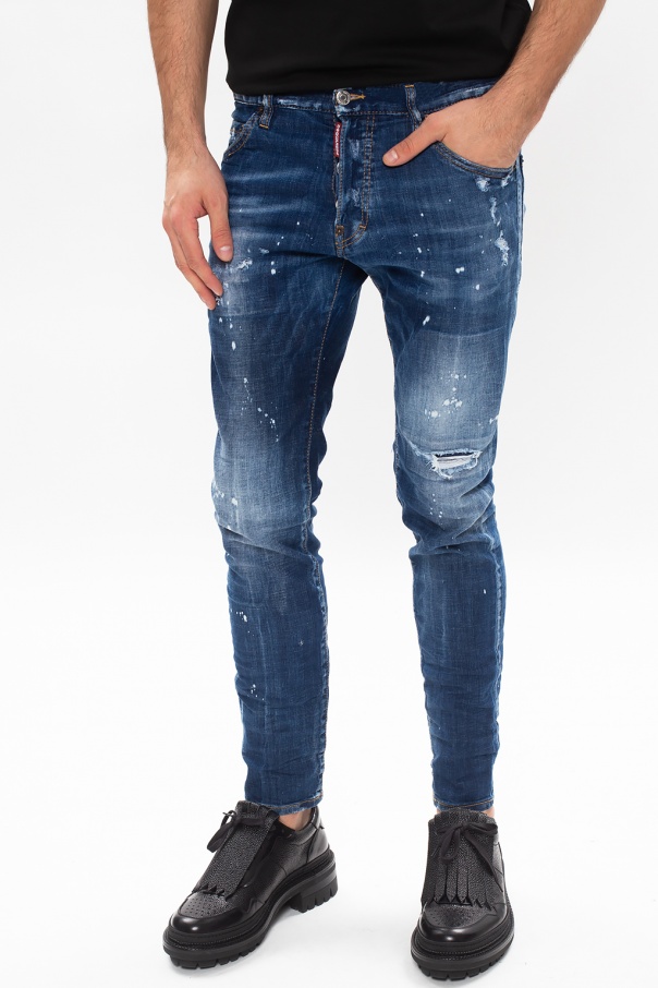 Navy and white ‘Cool Guy Jean’ jeans from Dsquared2. Fastened with buttons, this tapered leg design features yellow stitching details, logo patches, white paint splatter effect, three front pockets, two back pockets and a raw cut edge.