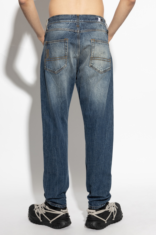 Blue distressed jeans from Moncler Genius, 'Fragment' collection. Zip and button fastenings. 5-pocket design. Tapered legs. Dark grey metal hardware.